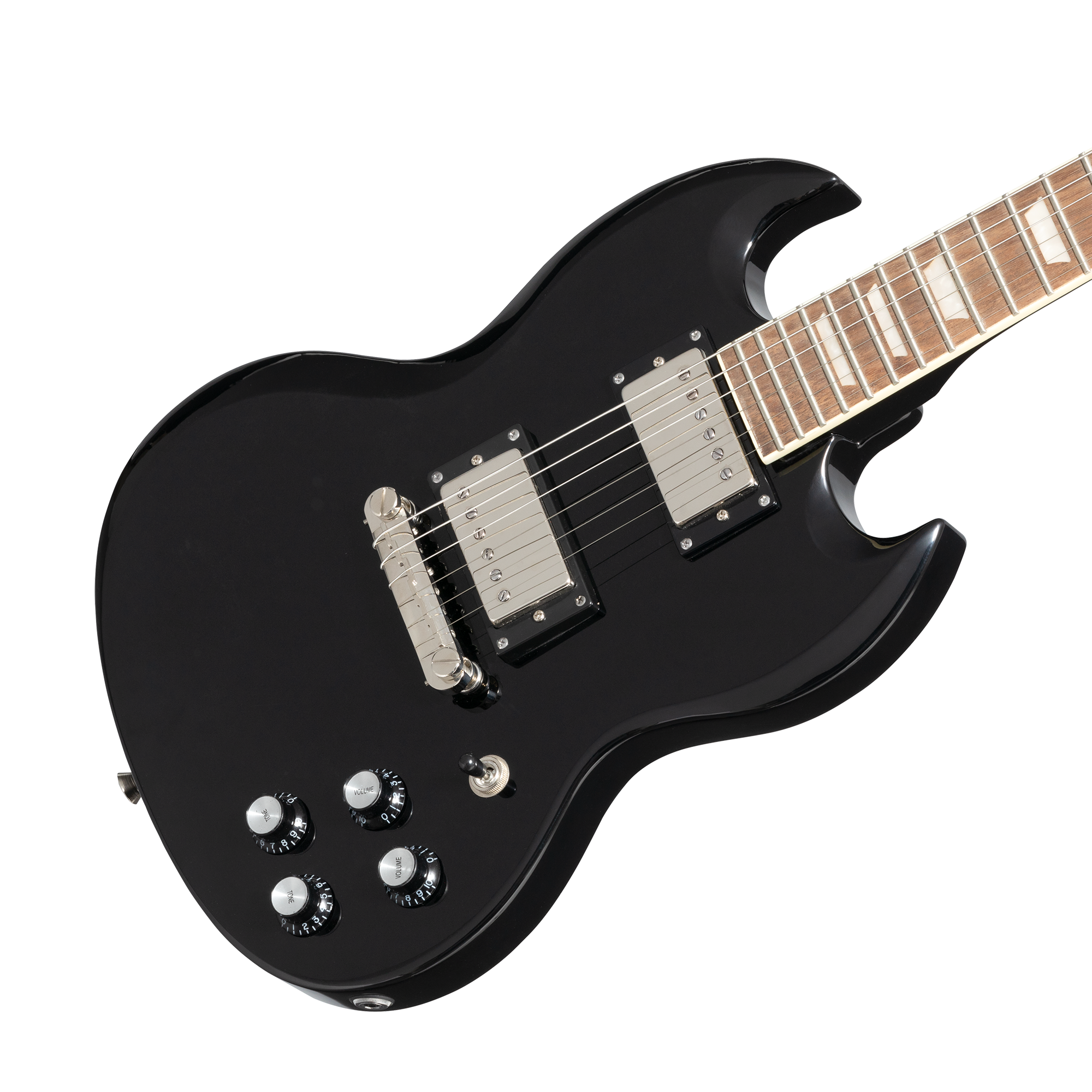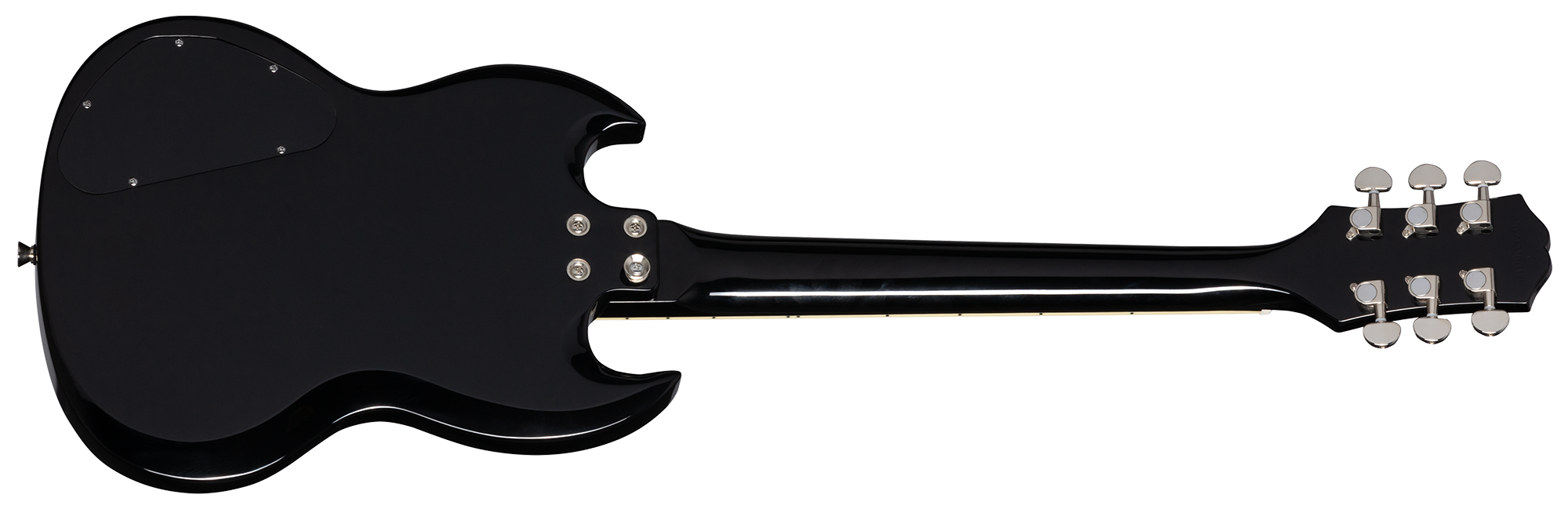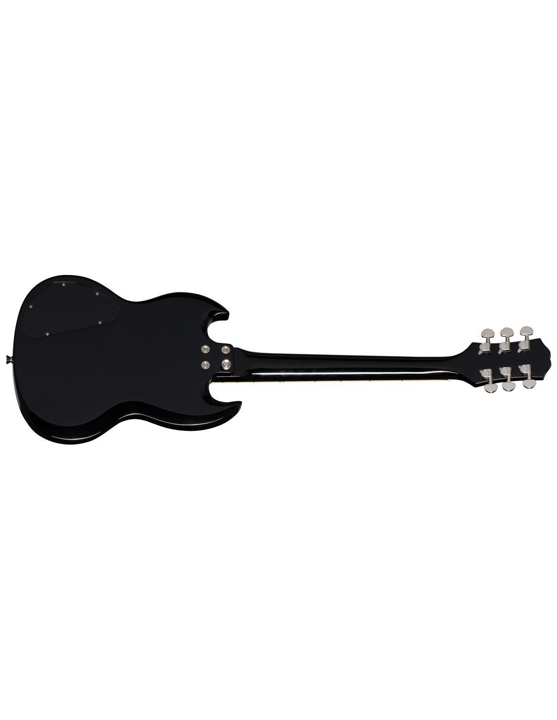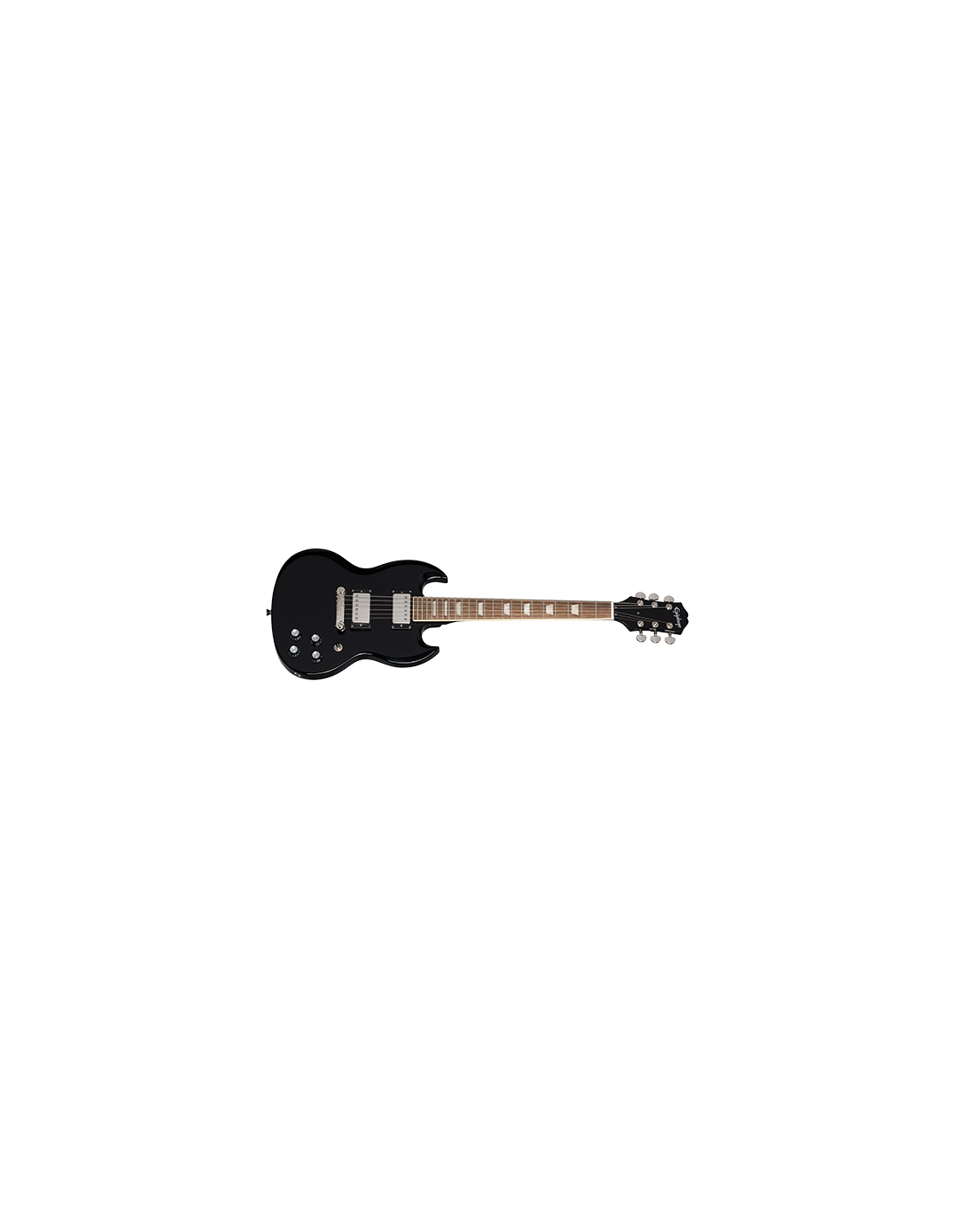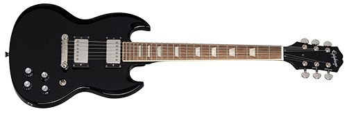 EPIPHONE POWER PLAYERS SG EBONY è una chitarra elettrica solid body a scala corta 3/4, con corpo in mogano rilegato, manico in mogano a profilo a D SlimTaper, tastiera a scala corta in alloro indiano a raggio 12" con 22 tasti Medium-Jumbo ed intarsi trapezioidali, meccaniche pressofuse com manopole Kidney, hardware nichelato, ponte Epiphone Lightning Bar Wraparound e capotasto in plastica. L'elettronica consiste in 2 pickup Humbucker: Humbucker 650R al manico e 700T al ponte con potenziometri CTS e controlli 2x volume/ 2x tono con selettore pickup a 3 vie.