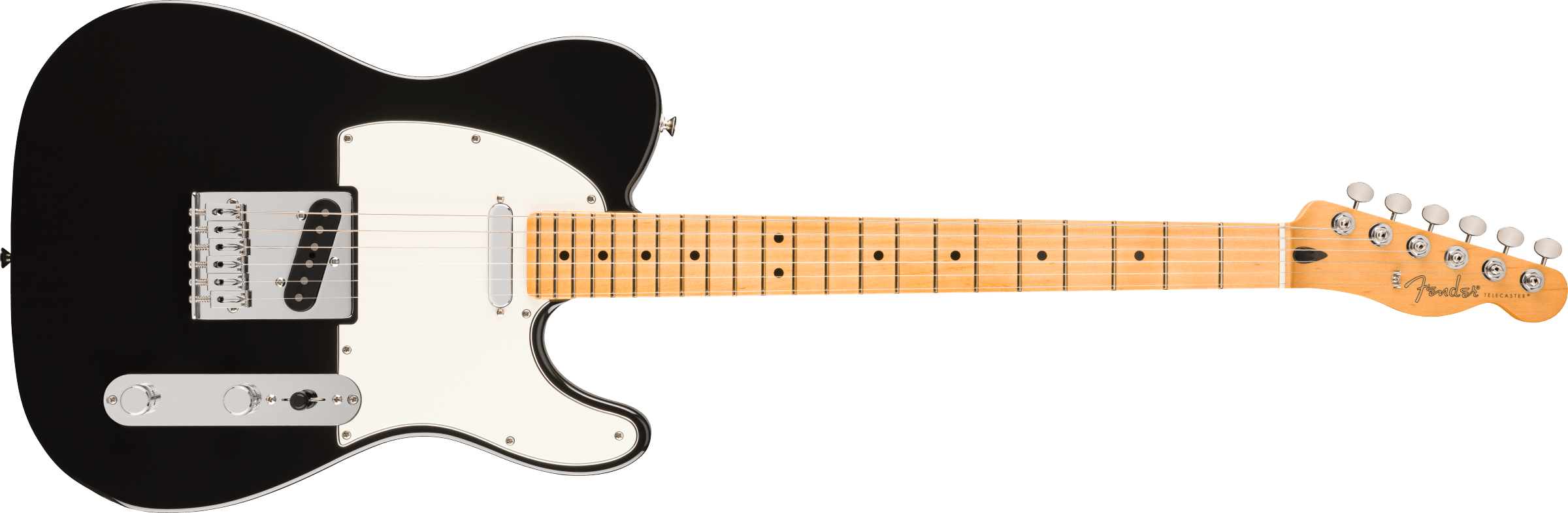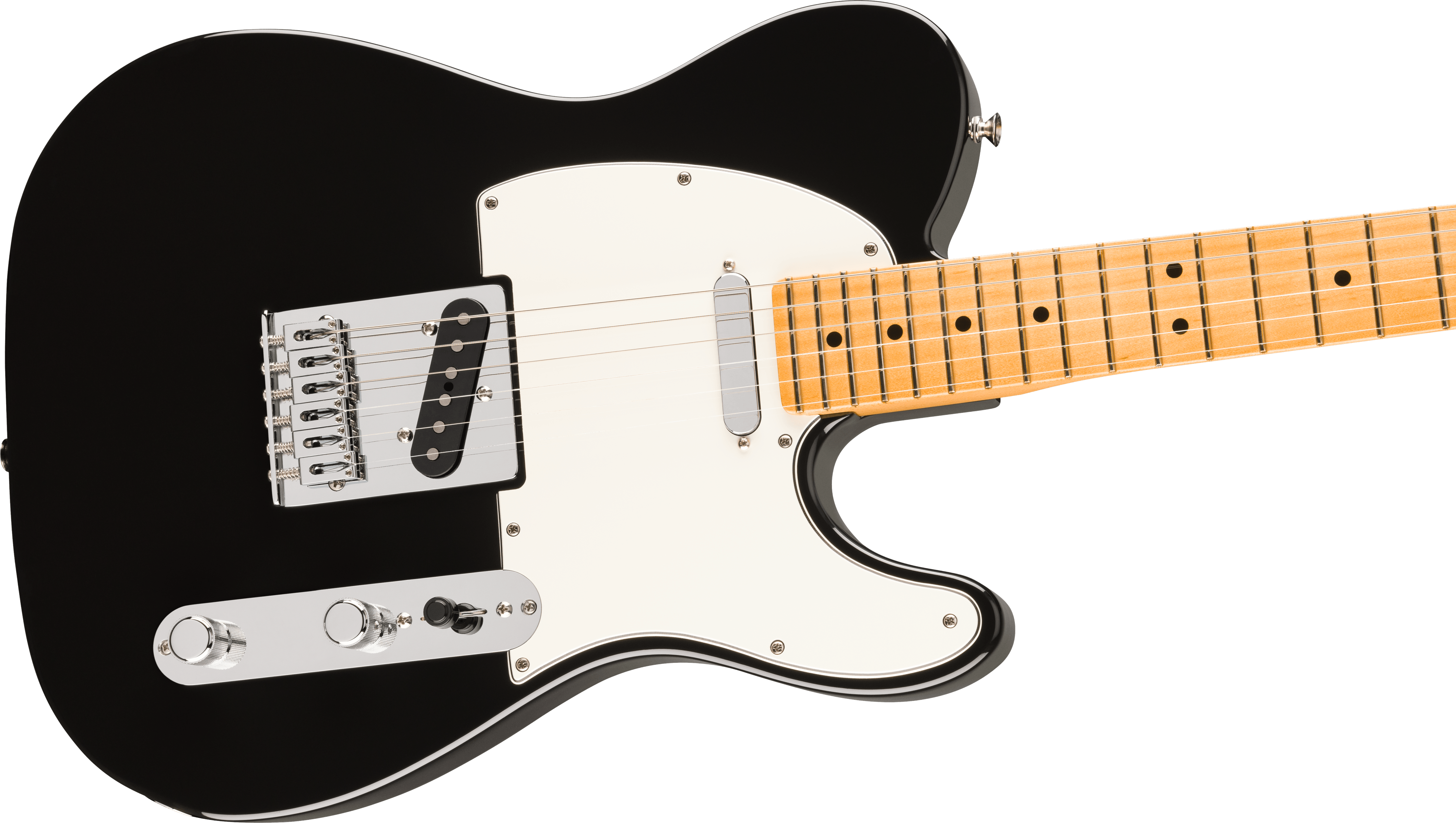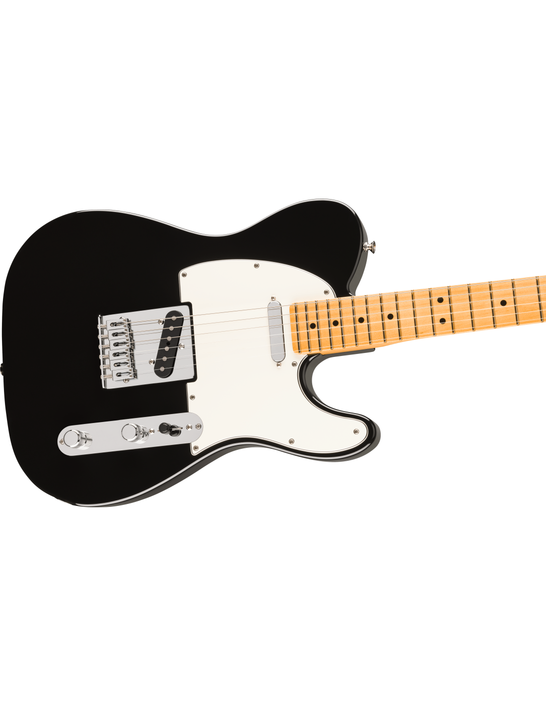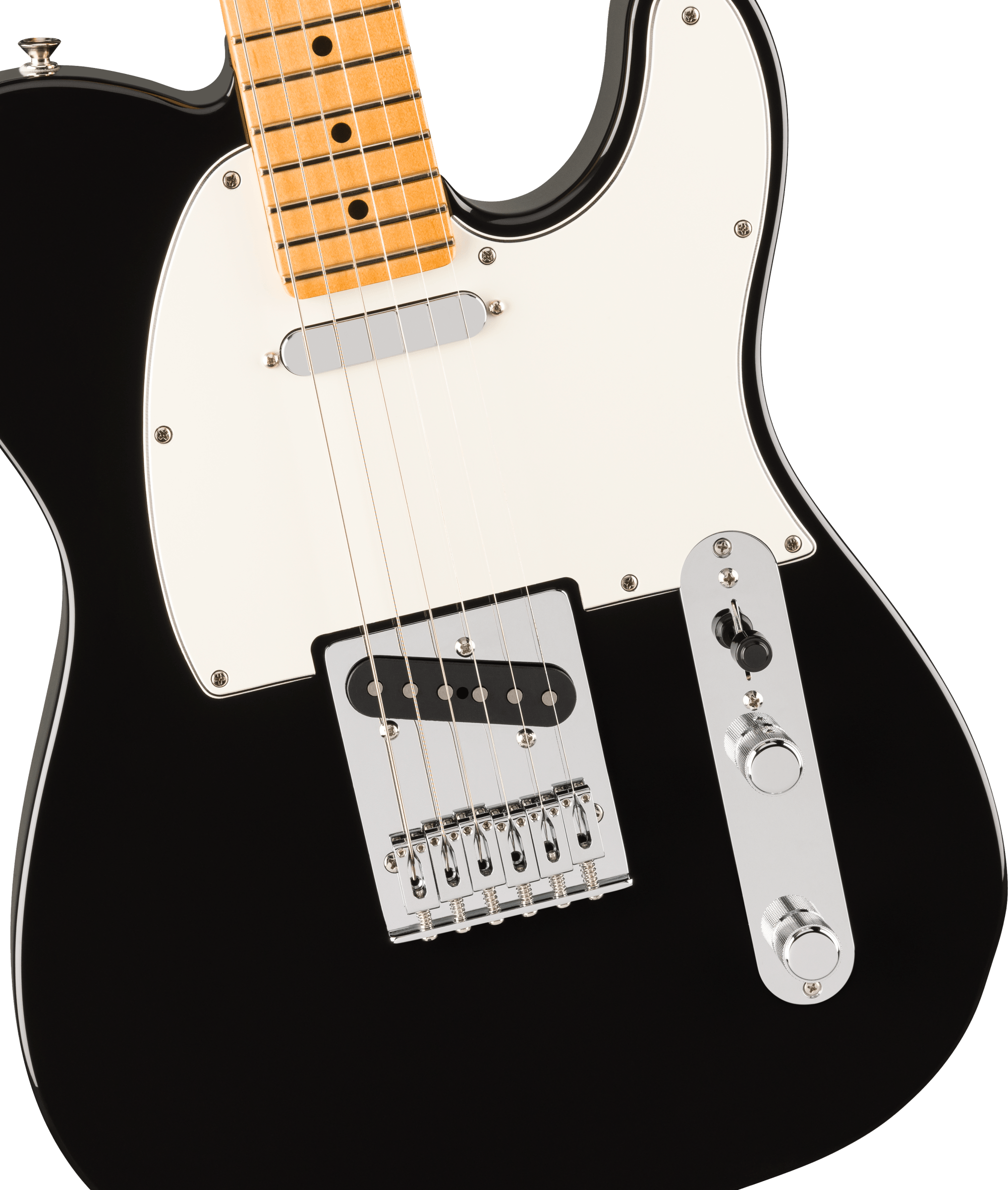 FENDER PLAYER II TELE MN BLK è una chitarra elettrica solid body, modello Player II Telecaster, con corpo in Alder (Ontano) e finitura Gloss Polyester, manico in acero a profilo Modern C-profile, tastiera in acero a raggio 9,5" con 22 tasti Medium Jumbo e intarsi Black Dots, capotasto in osso sintetico, hardware cromato, Truss Rod Single Action Head Adjust, meccaniche Fender ClassicGear con alberelli abbassacorde Dual-Wing, ponte String-Through-Body Tele a 6 sellette Block Steel e battipenna 3-Ply Parchment. L'elettronica a configurazione SS, consiste in 2 pickup Single-Coil Player Series Alnico V Tele con controllo Master Volume, Master tono e selettore pickup a 3 vie.
