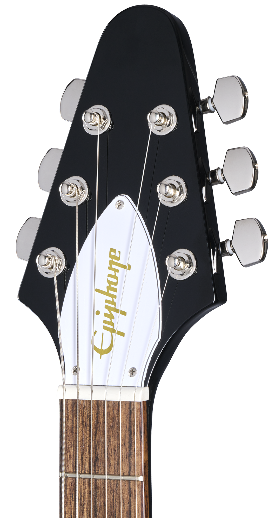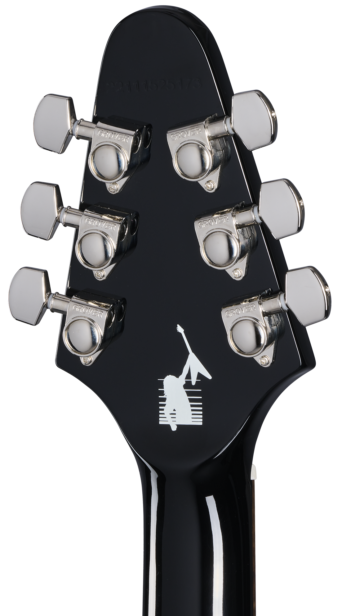 EPIPHONE KIRK HAMMETT 1979 FLYING V EBONY + CASE è una chitarra elettrica solid body, modello signature Kirk Hammett 1979 Flying V, con corpo in mogano, manico in mogano monopezzo a profilo Rounded "C" with Volute, tastiera in alloro indiano a raggio 12" con 22 tasti Medium Jumbo e intarsi Pearl Dots, capotasto in Graph Tech NuBone XL, hardware nichelato, Truss Rod a doppia azione, meccaniche Grover Rotomatic con Spade Button e ponte Epiphone Custom con cordiera LockTone Stop Bar. L'elettronica consiste in 2 pickup humbucker Gibson USA Calibrated T-Type con potenziometri CTS e condensatori Orange Drop, 2 controlli del volume, 1 per il tono e mini toggle Switchcaft a 3 vie per selezione pickup. Include custodia rigida Epiphone dedicata