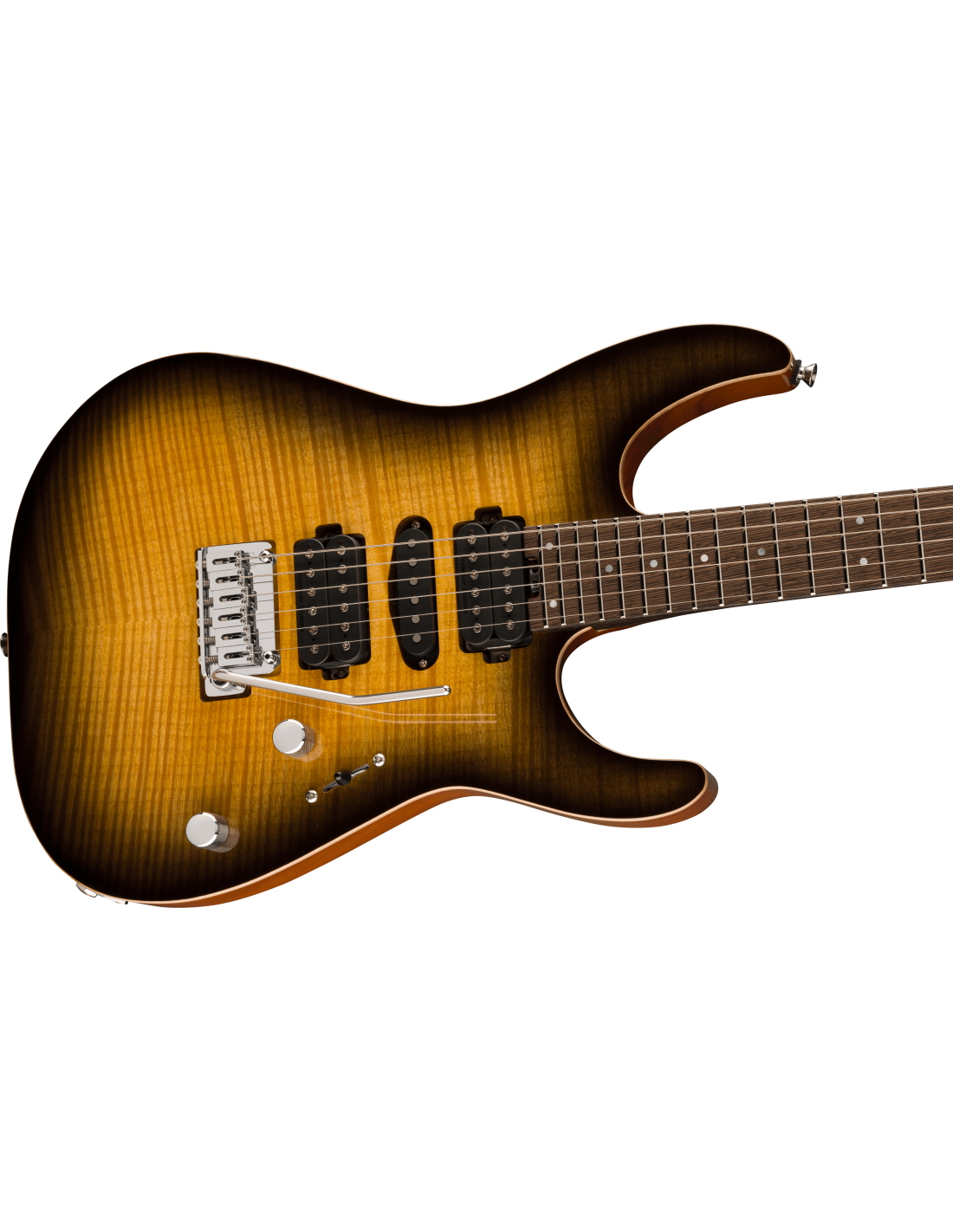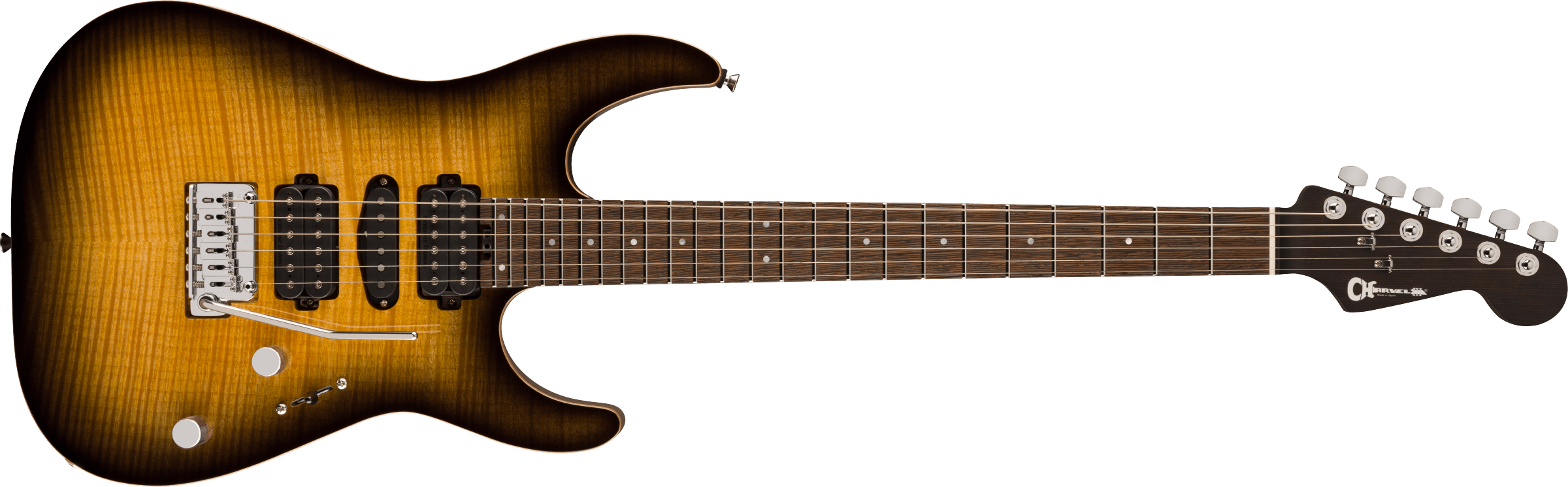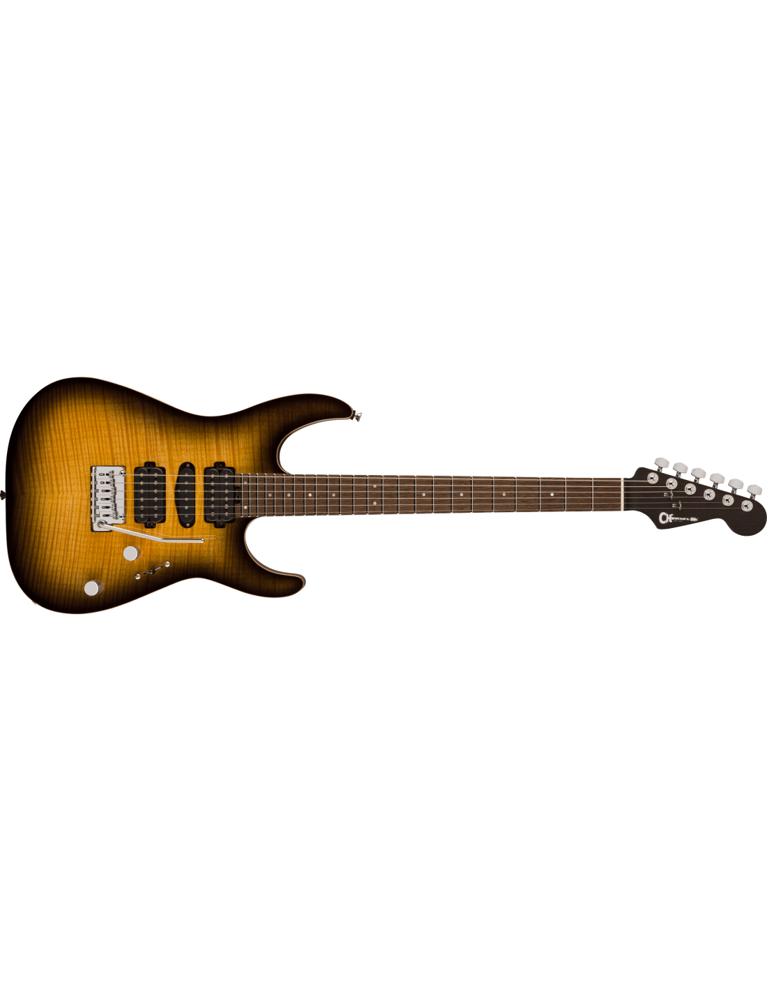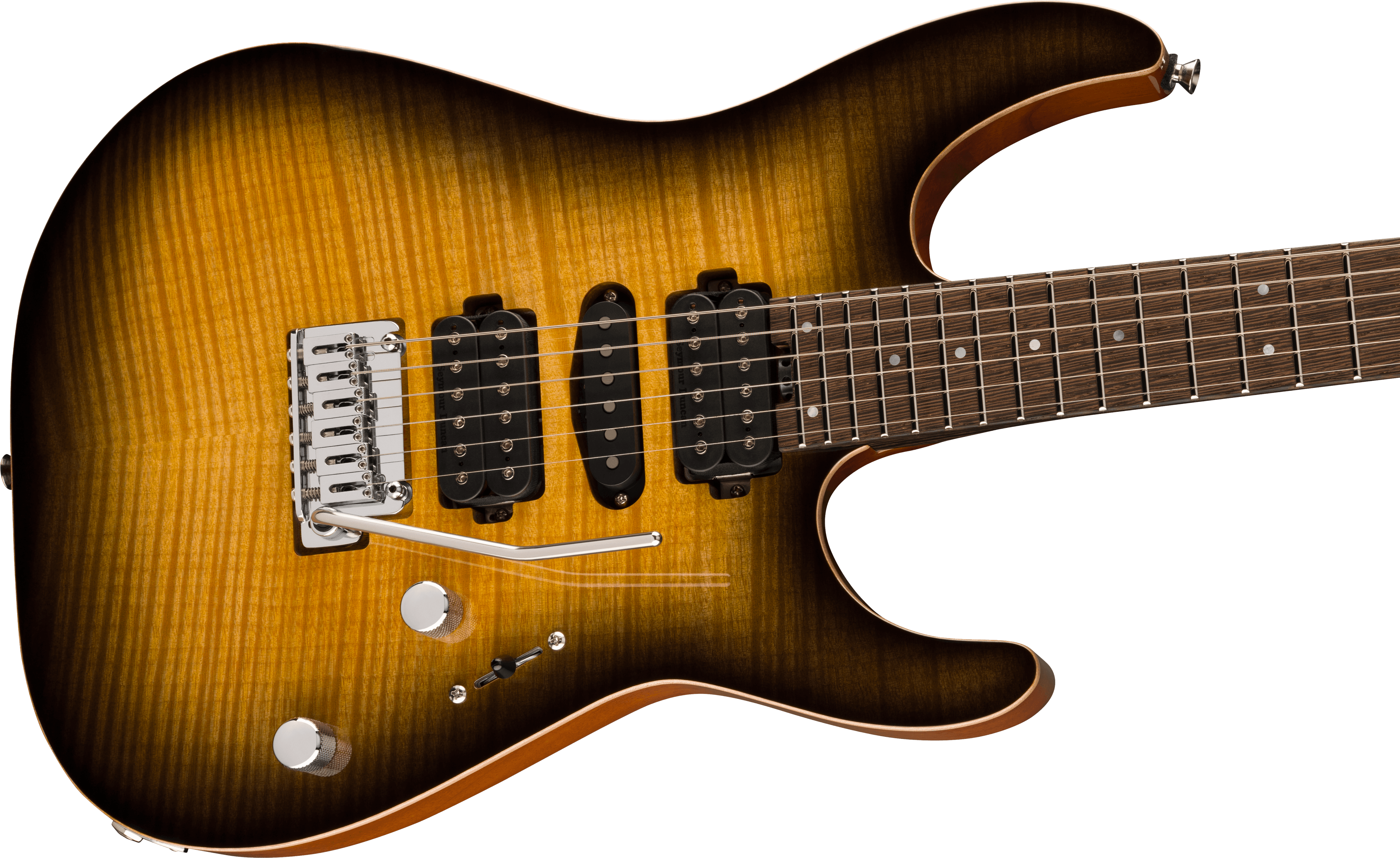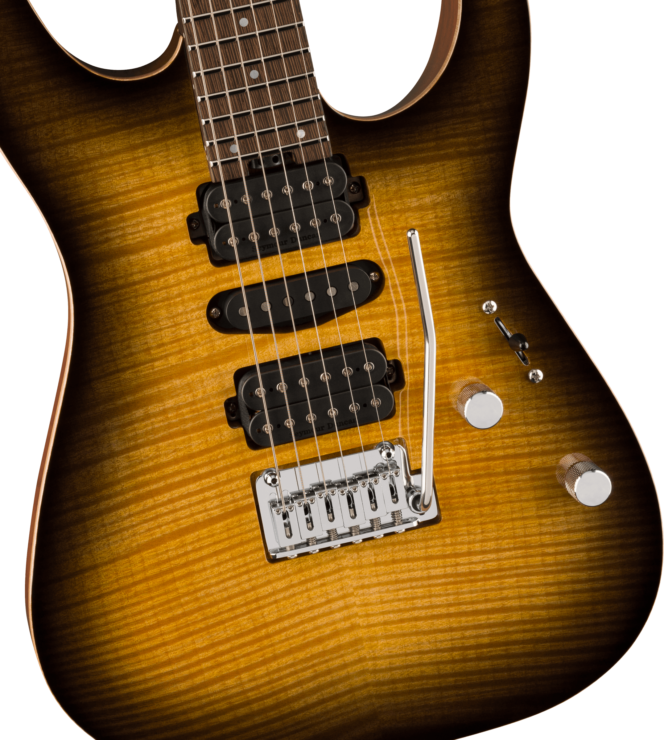 CHARVEL MJ DK24 HSH ANTIQUE BURST W/CASE è una chitarra elettrica solid body formato Dinky, serie MJ DK24 con corpo in mogano gloss, manico in Wenge a profilo Speed Neck con bordi arrotondati e rinforzo in grafite, tastiera in Wenge a raggio composito 12"-16" con 24 tasti Jumbo e intarsi Pearl Dots, capotasto Graph Tech TUSQ XL, hardware cromato, meccaniche Charvel-Branded pressofuse e ponte Gotoh Custom 510 Tremolo. L'elettronica a configurazione HSH, consiste in 1 pickup humbucker Seymour Duncan Full Shred TB-10 al ponte, 1 pickup Seymour Duncan Custom Flat Strat SSL-6 Single-Coil al centro e 1 pickup humbucker Custom Seymour Duncan Alnico II Pro APH-1N al manico, potenziometri 500K EVH Bourns, controlli del volume, del tono, e switch selettore pickup a 5 posizioni. Include la custodia Charvel Multi-Fit Hardshell Gig Bag
