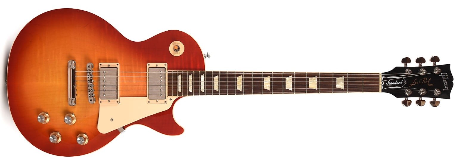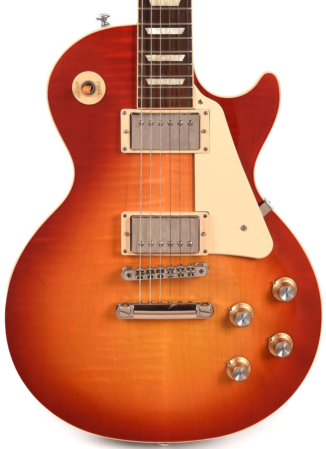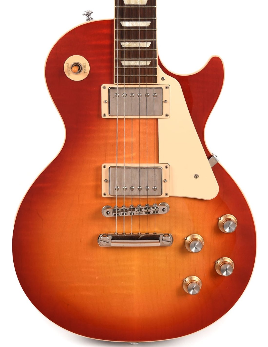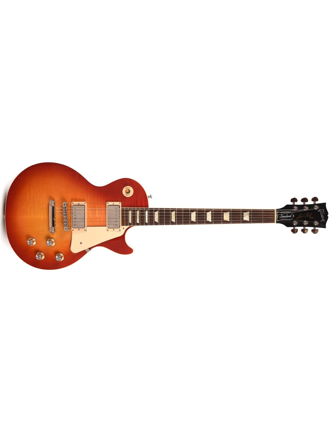 GIBSON LES PAUL STANDARD '60s TOMATO SOUP BURST è una chitarra elettrica solid body, modello Gibson Original Les Paul Standard 60s CME Exclusive, con corpo in Mogano e top in Acero figurato AA a finitura Gloss Nitrocellulose Lacquer, manico in Mogano a profilo '60 SlimTaper, tastiera in Palissandro Indiano a raggio 12" con 22 tasti Medium-Jumbo e intarsi Acrylic Trapezoids, capotasto in Graph Tech, hardware nichelato, meccaniche Grover Rotomatic con chiavi Kidney e ponte Gibson ABR-1 Tune-O-Matic con cordiera Aluminum Stop Bar. L'elettronica a configurazione HH, consiste in 2 pickup Humbucker CME T-Types cablati a mano con condensatori Orange Drop, 2 controlli Master Volume, 2 controlli Master Tone e selettore pickup a 3 vie. Include la custodia Gibson Hardshell case.