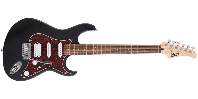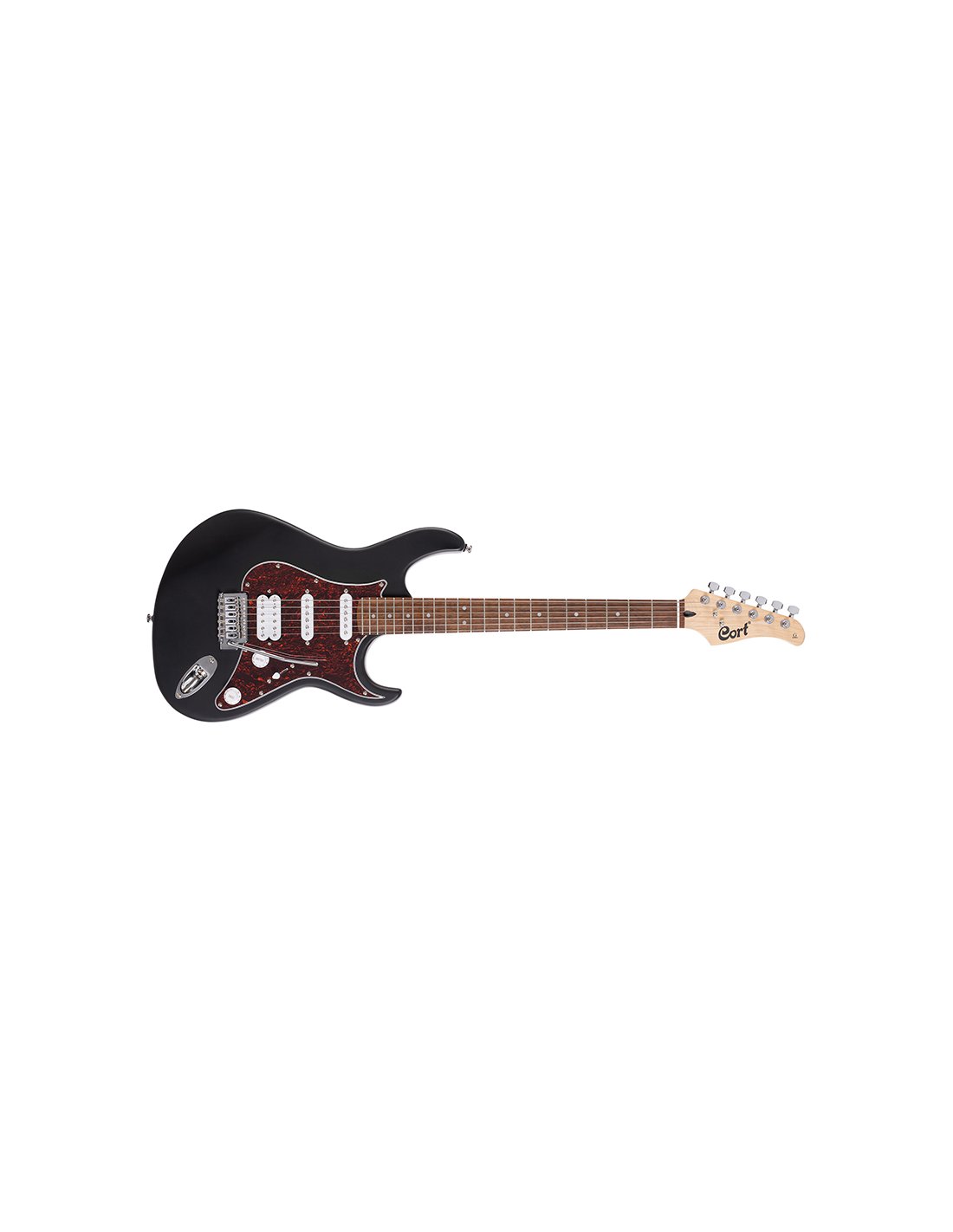 Chitarra Elettrica Solid-Body. Costruzione: Bolt-On. Scala: 25.5 (648 mm). Design: G Series. Corpo: Pioppo (spessore 39 mm - 1 17/32"). Manico: Acero. Tastiera: Jatoba. Radius Tastiera: 9.45" (240 mm). Tasti: 22. Inlay: White Dot. Larghezza al Capotasto: 42 mm (1 21/32"). Hardware: Chrome. Meccaniche: Cort cromate. Ponte: Cort VintageTremolo 6-viti. Pick-Up: Cort Powersound HSS. Elettronica: Volume, Tone, 5-way Switch. Colore: OPBK - Open Pore Black. Corde: Rivestite