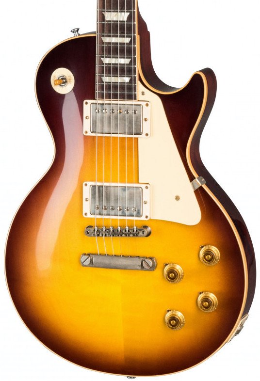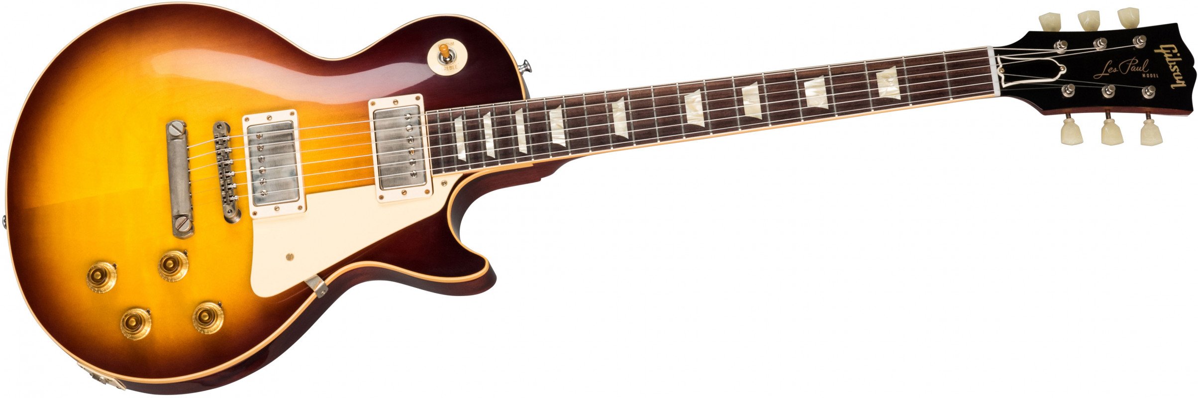GIBSON LES PAUL '58 STANDARD BOURBON BURST VOS NH. Chitarra elettrica Solid body Gibson Les Paul Standard '58 Reissue Custom shop con corpo in acero figurato 2 pezzi, fondo in mogano leggero monopezzo, manico in mogano massello a profilo Chunky C-Shape, tastiera in palissandro indiano a raggio 12" con 22 tasti Narrow/Tall ed intarsi trapezoidali in nitrato di cellulosa invecchiato, hardware dorato e ponte No-Wire ABR-1. L' elettronica consiste in 2 pickup Custombucker Alnico III al ponte e al manico con potenziometri conici CTS 500K, condensatori carta-olio e selettore pickup Switchcraft a 3 vie. Include custodia rigida Gibson, medaglione Gibson Custom Switchplate con libretto del certificato di autenticità e cartellini della ristampa storica.