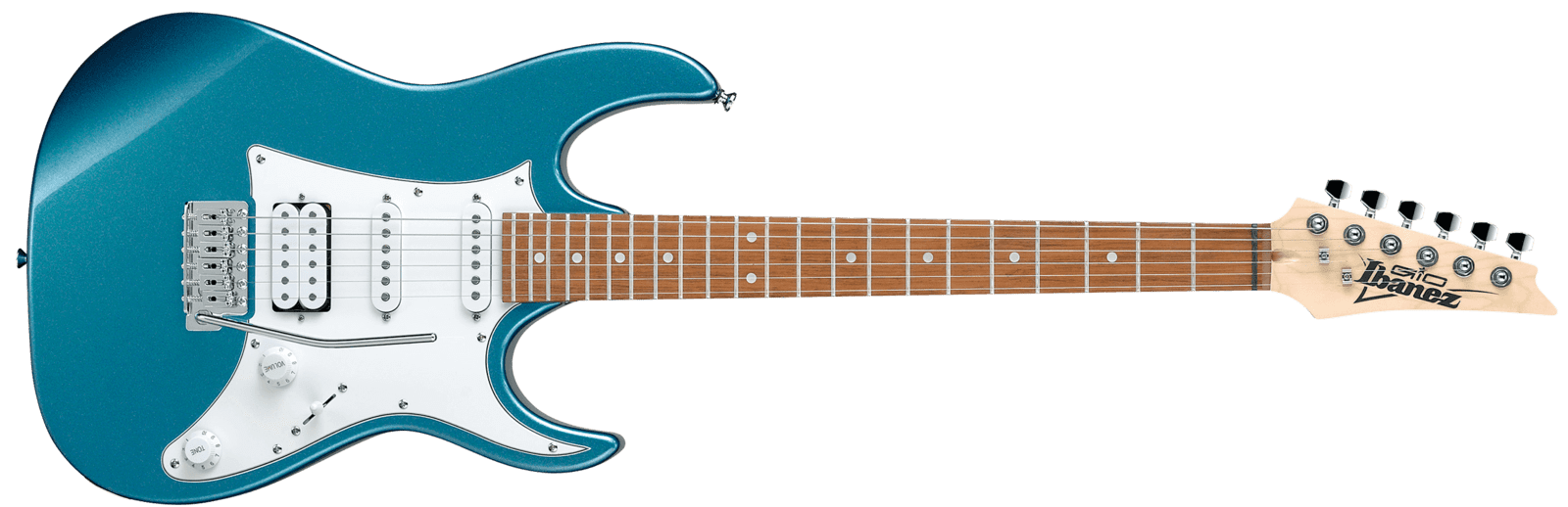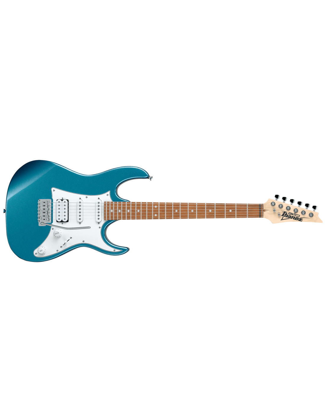IBANEZ GRX40 MLB. Chitarra elettrica serie Ibanez GIO con corpo in pioppo, manico in acero, tastiera in Jatoba a raggio 12" con 22 tasti Medium Jumbo, intarsi dot bianchi e finitura Metallic Light Blue. L'elettronica a configurazione HSS è dotata di 1 pickup Humbucker Infinity R al ponte e di 2 Pickup Single Coil Infinity S al centro e al manico con controlli Master Volume, Master Tone, selettore a 5 vie. Presenta inoltre ponte tremolo con leva Ibanez T-106 e meccaniche cromate.