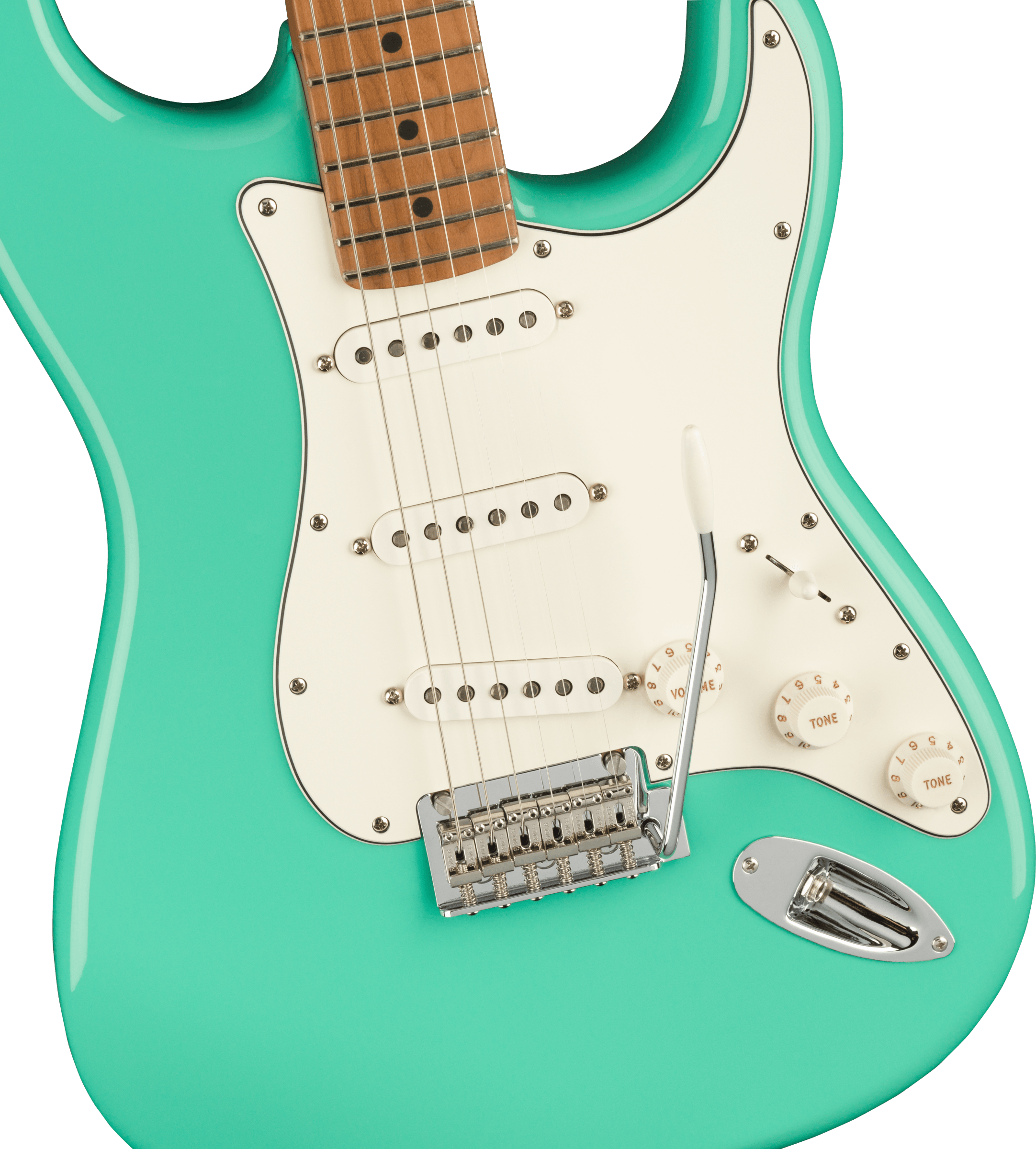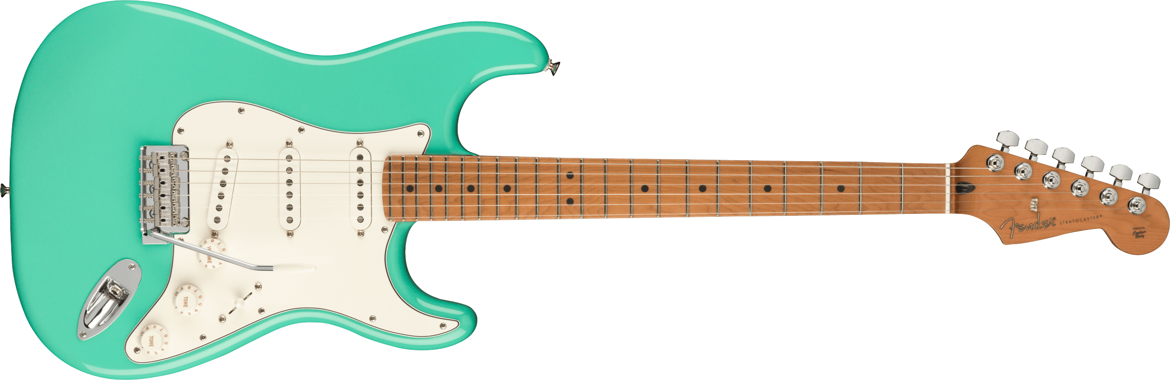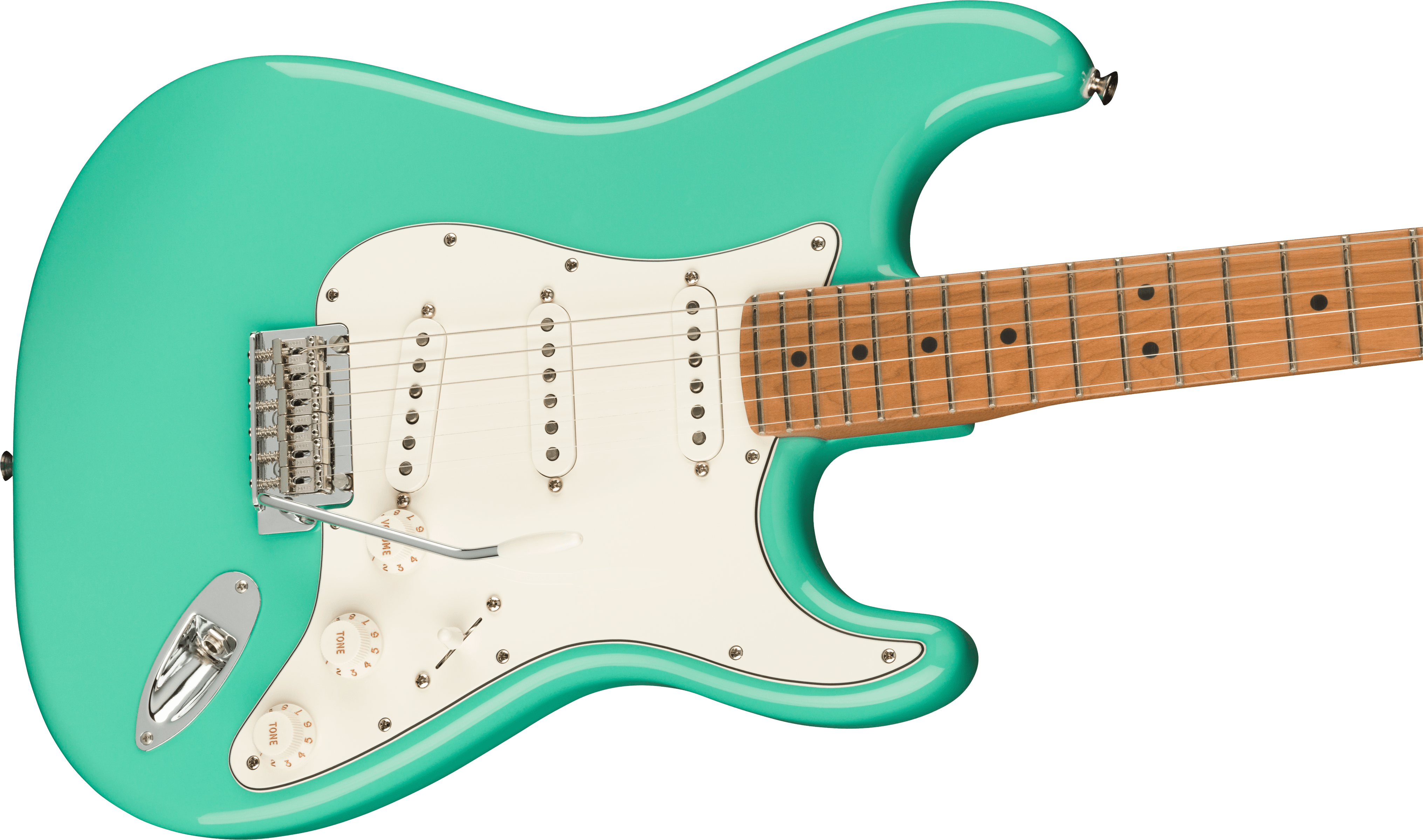 FENDER DE PLAYER STRAT ROASTED MN SFMG è una chitarra elettrica solid body, modello Limited Edition Player Stratocaster, con corpo in Alder (ontano) e finitura Gloss Polyester, manico in acero Roasted a profilo Modern "C", tastiera in acero Roasted a raggio 9,5" con 22 tasti Medium Jumbo e intarsi Black Dots, Truss Rod Standard, capotasto in osso sintetico, hardware nichelato, meccaniche Fender Standard Cast/Sealed con abbassacorde Dual Wing e ponte Fender 2-points Synchronized Tremolo con sellette in acciaio piegato. L'elettronica a configurazione SSS, consiste in 3 pickup Single Coil Player Series Alnico 5 Strat, con controllo Master Volume, 2 controlli del tono e selettore pickup a 5 vie.