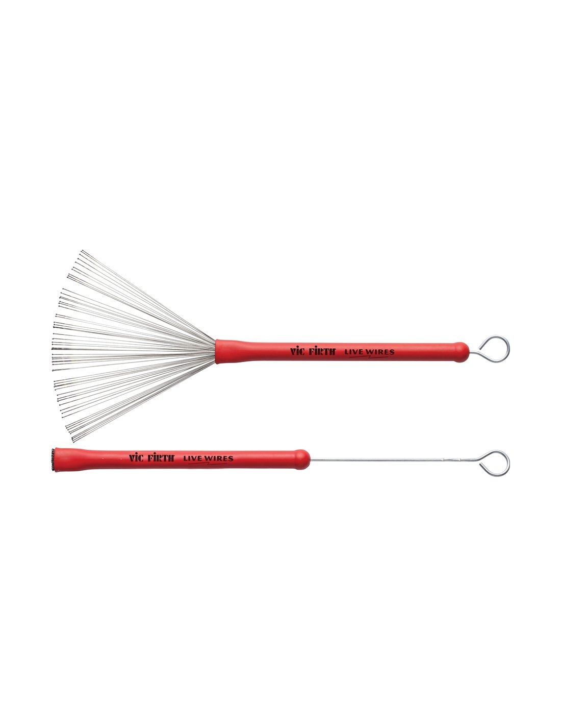 Spazzole Vic Firth AB LW Live Wire. Le Vic Firth AB LW Live Wire sono spazzole retrattili in metallo con impugnatura in gomma. Vengono utilizzate principalmente sulla batteria e nella musica jazz, ma possono essere usate su diversi tipi di percussioni per ottenere un suono particolare. Sulla punta di ogni setola è presente una piccola “perlina” che aggiunge un suono molto acuto e squillante