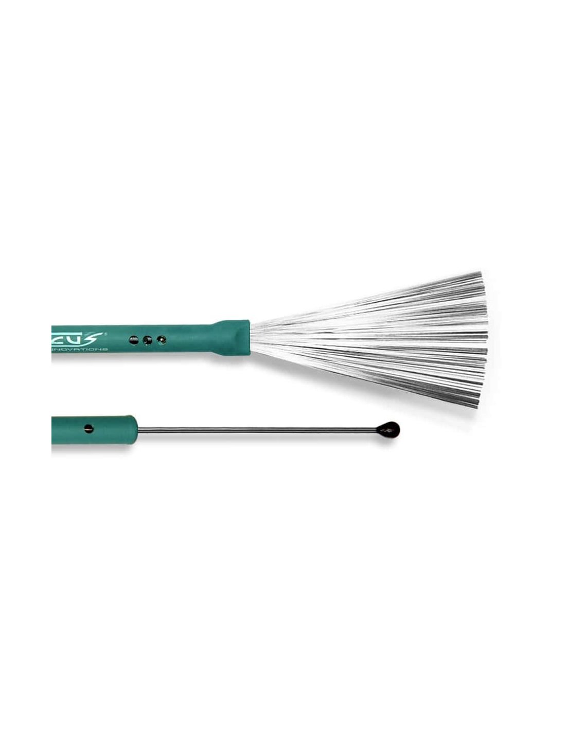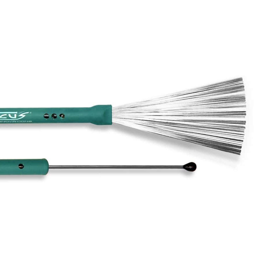 FACUS BRUSHES LIGHT. Coppia di spazzole leggere in filo di acciaio armonico di diametro 0,30mm, con manico in alluminio rivestito in gomma verde e sistema di bloccaggio a 3 posizioni. Adatta a qualsiasi genere musicale pop jazz blues funky ecc.