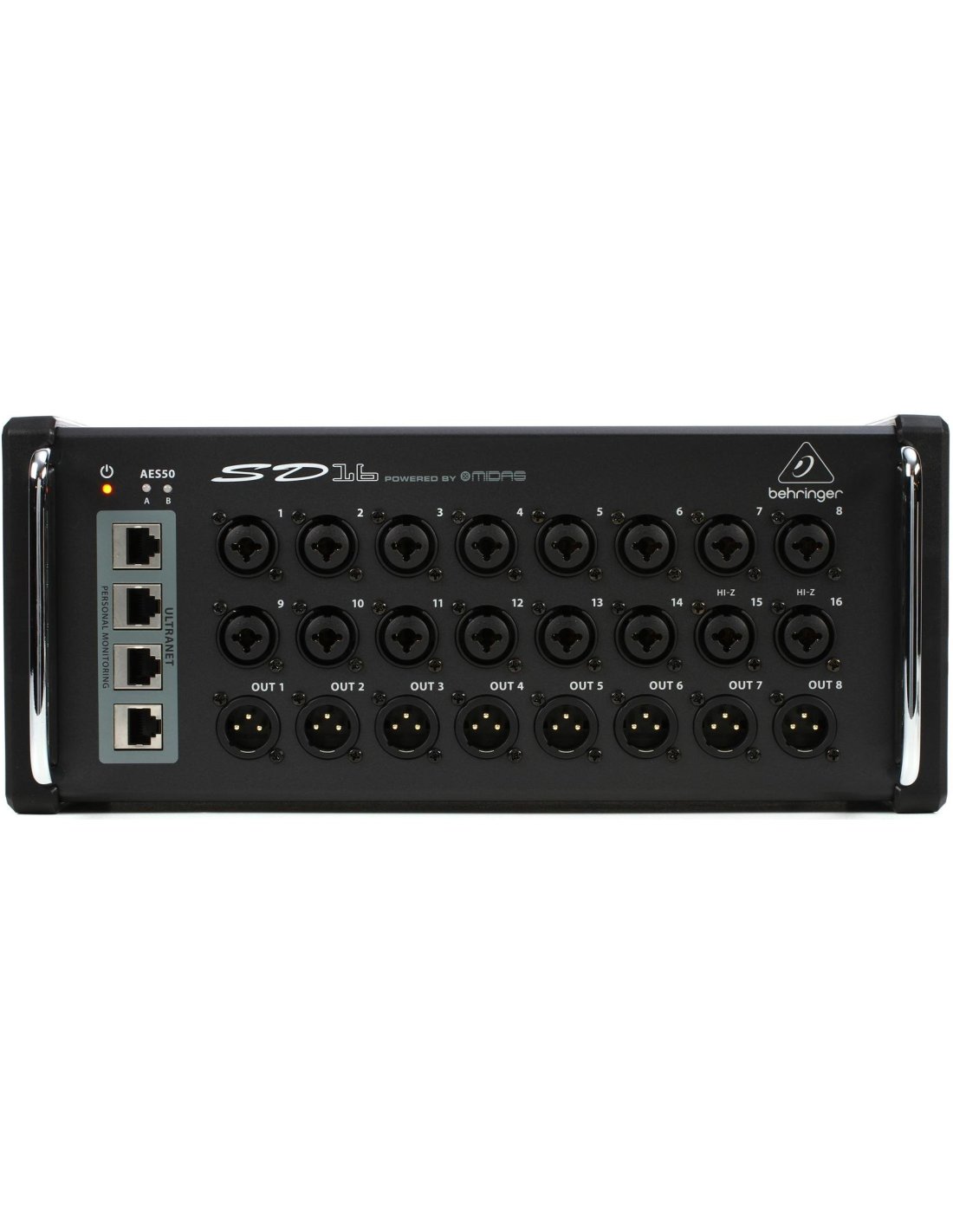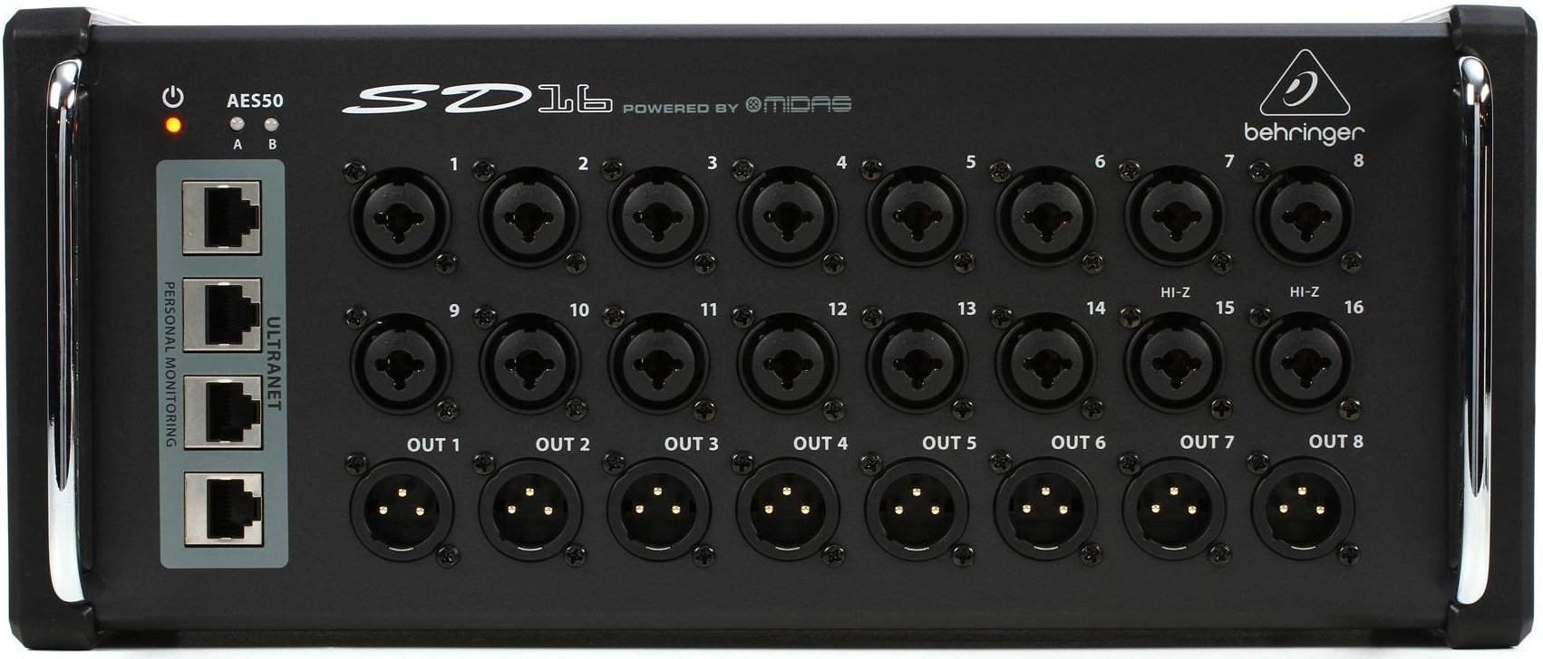 BEHRINGER SD16 è una stage box digitale a 16 canali con 16 preamplificatori microfonici Midas controllabili da remoto, 8 uscite XLR servo bilanciate, 2 porte di rete AES50 con connettore Cat5e e tecnologia Klark Teknik Supermac, connettività Ultranet per il collegamento del monitoraggio a remoto con i mixer monitor personali Behringer P16-M. In dotazione staffe per montaggio a rack.