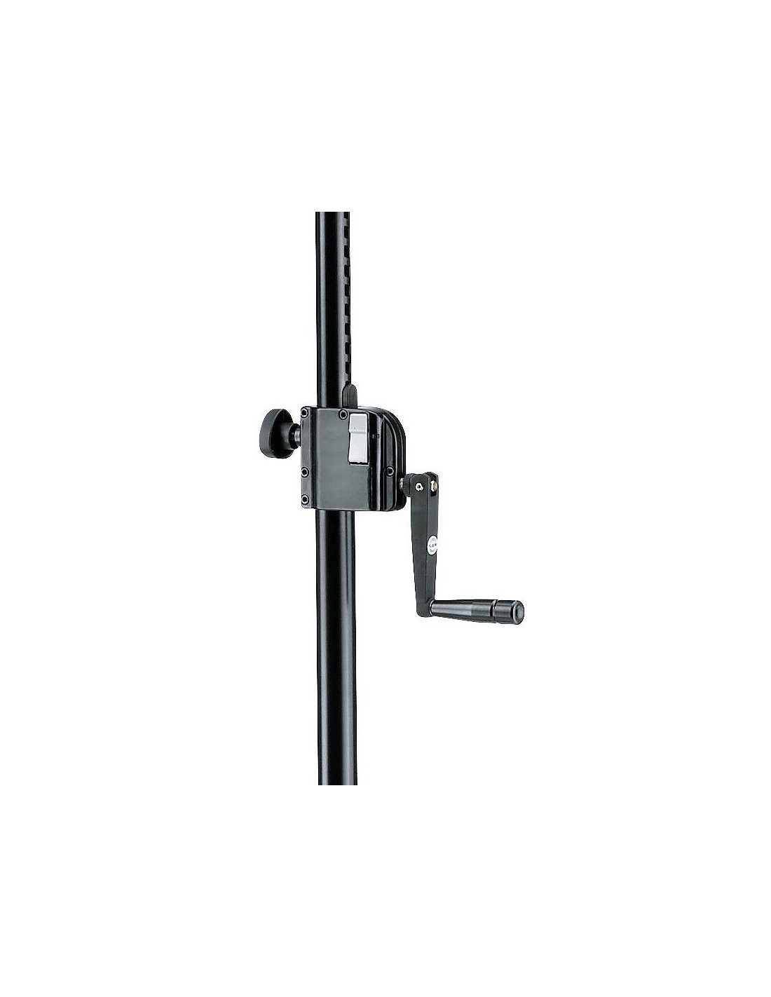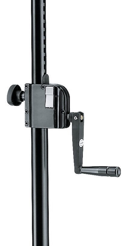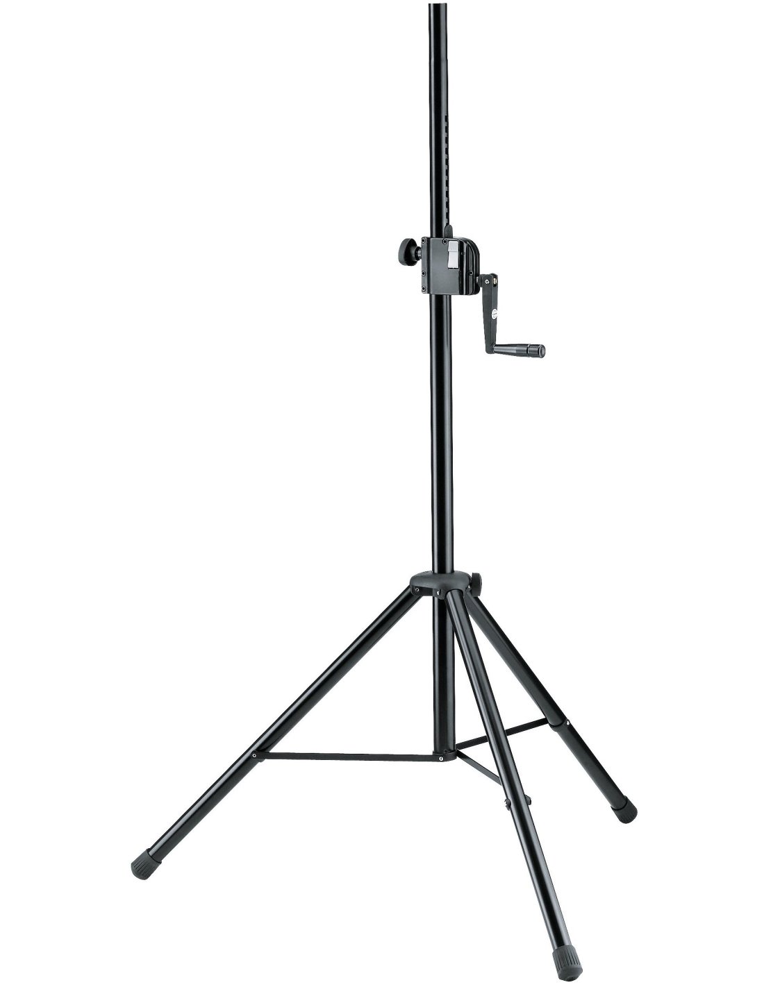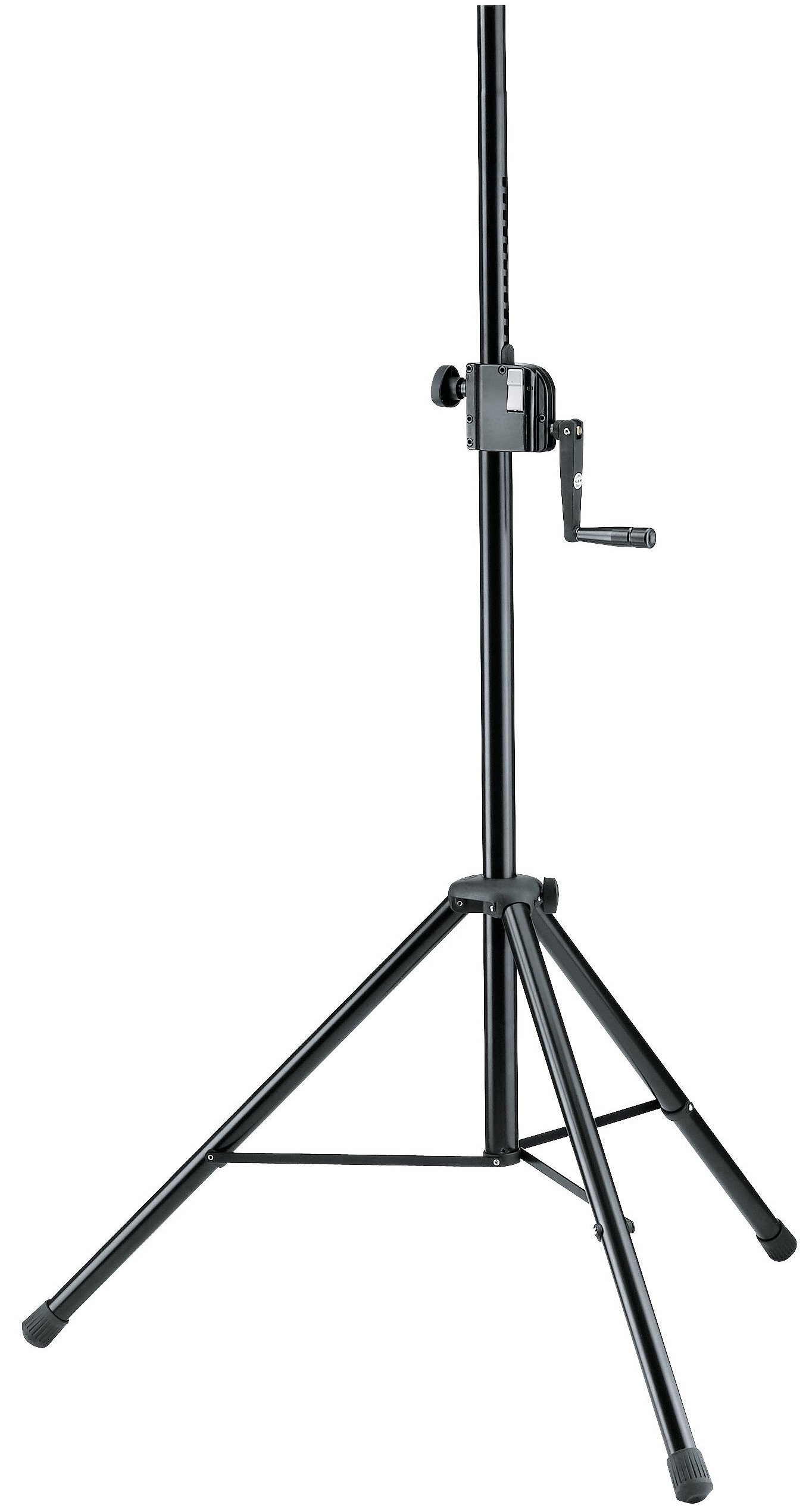 K&M 21302-009-55 è uno stativo in acciaio per speaker di alta qualità, con tubolari e 3 gambe con rinforzi trasversali, altezza regolabile tramite manovella con meccanismo di bloccaggio tramite pulsante e vite, capacità di carico massima di 40kg, design pieghevole in 2 pezzi