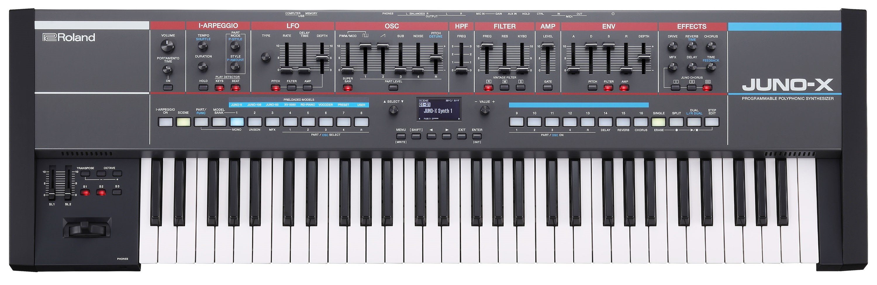 Il Juno-X è un sintetizzatore polifonico della Roland. E' dotato di un' interfaccia intuitiva per una semplice progettazione e modellazione del suono, generatore sonoro di nuova generazione con oltre 4000 preset inclusi i suoni dei modelli storici della serie Juno-60 e 106, XV-5080, RD e altri, nuovo oscillatore Super Saw, I-Arpeggiator e arpeggiatore retrò e interfaccia audio/MIDI USB.