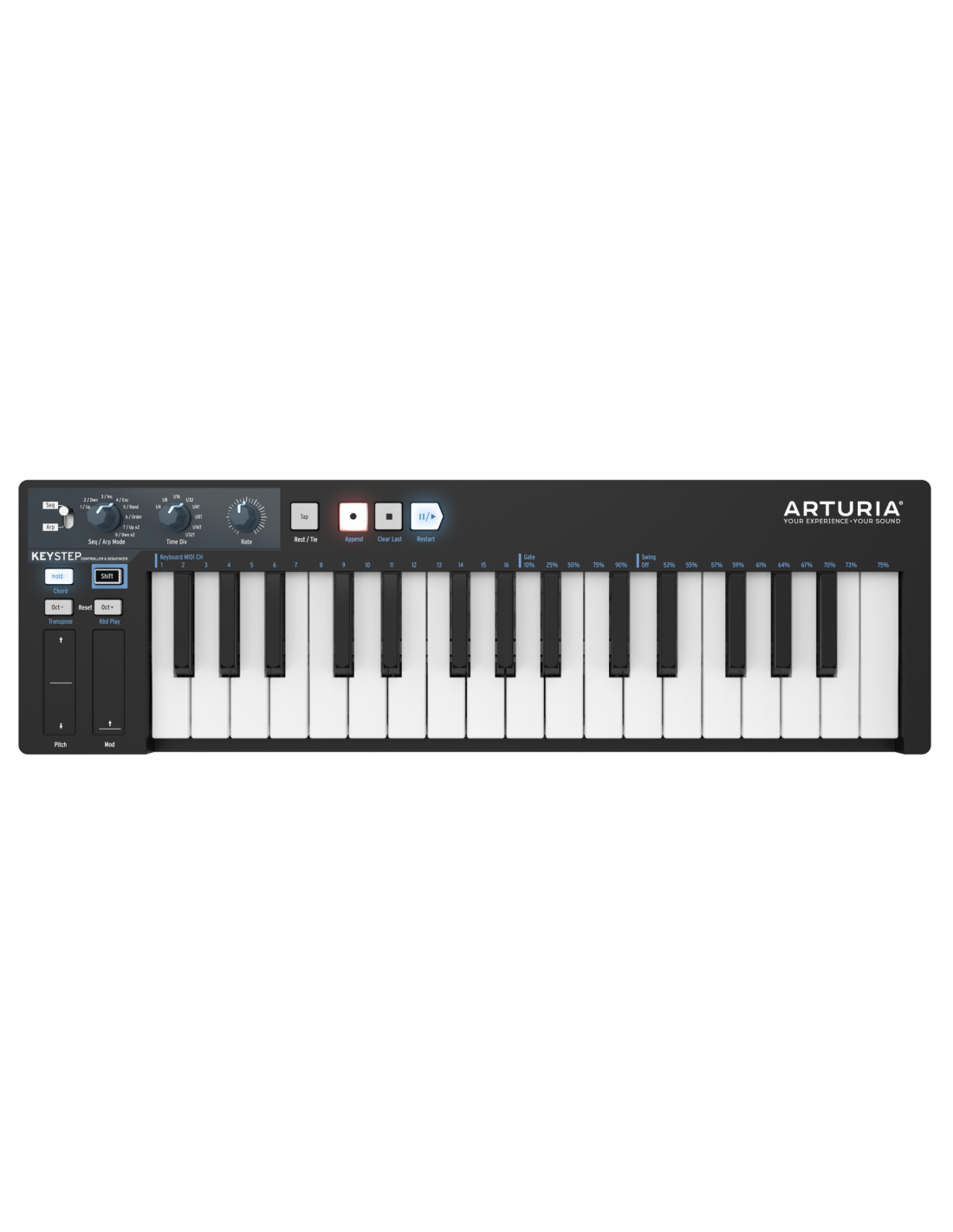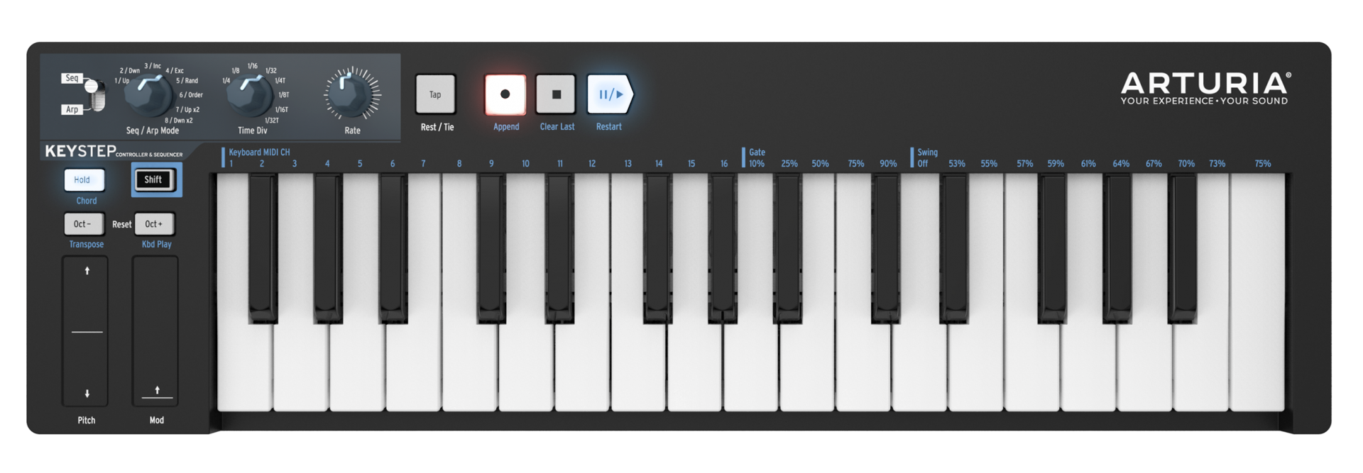 - Rate control e tap tempo: Pulsanti REC, PLAY e STOP per il controllo della performance su sequencer e arpeggiatore