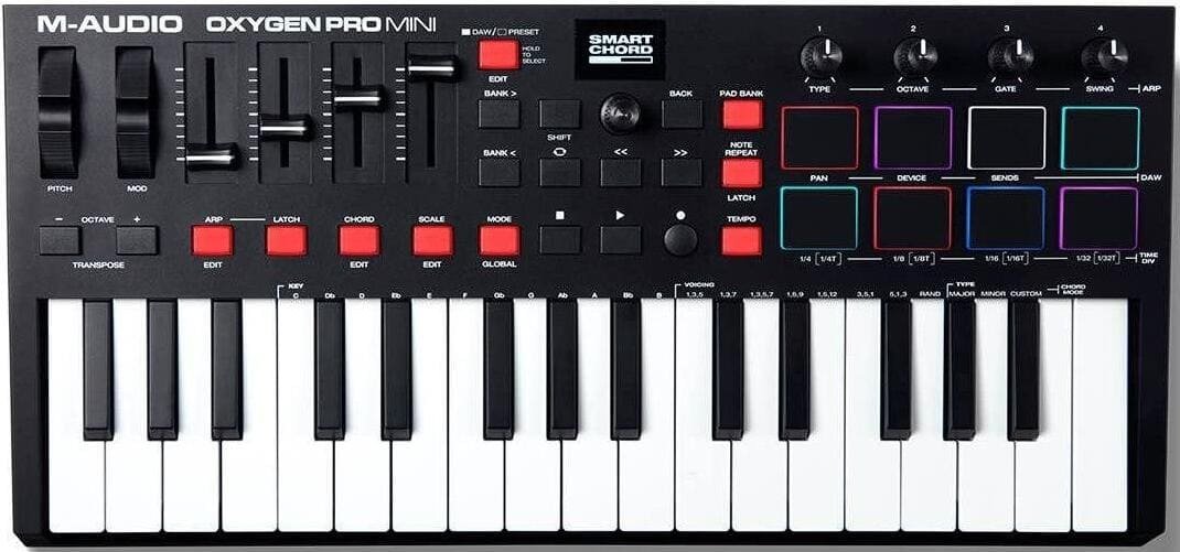 La Oxygen Pro Mini è una tastiera MIDI della M-Audio con 32 tasti. E' dotata di 8 pad retroilluminati sensibili alla dinamica, 4 manopole, pulsanti e fader assegnabili per il controllo di strumenti virtuali e DAW, display OLED e 2 ruote pitch bend e modulation.