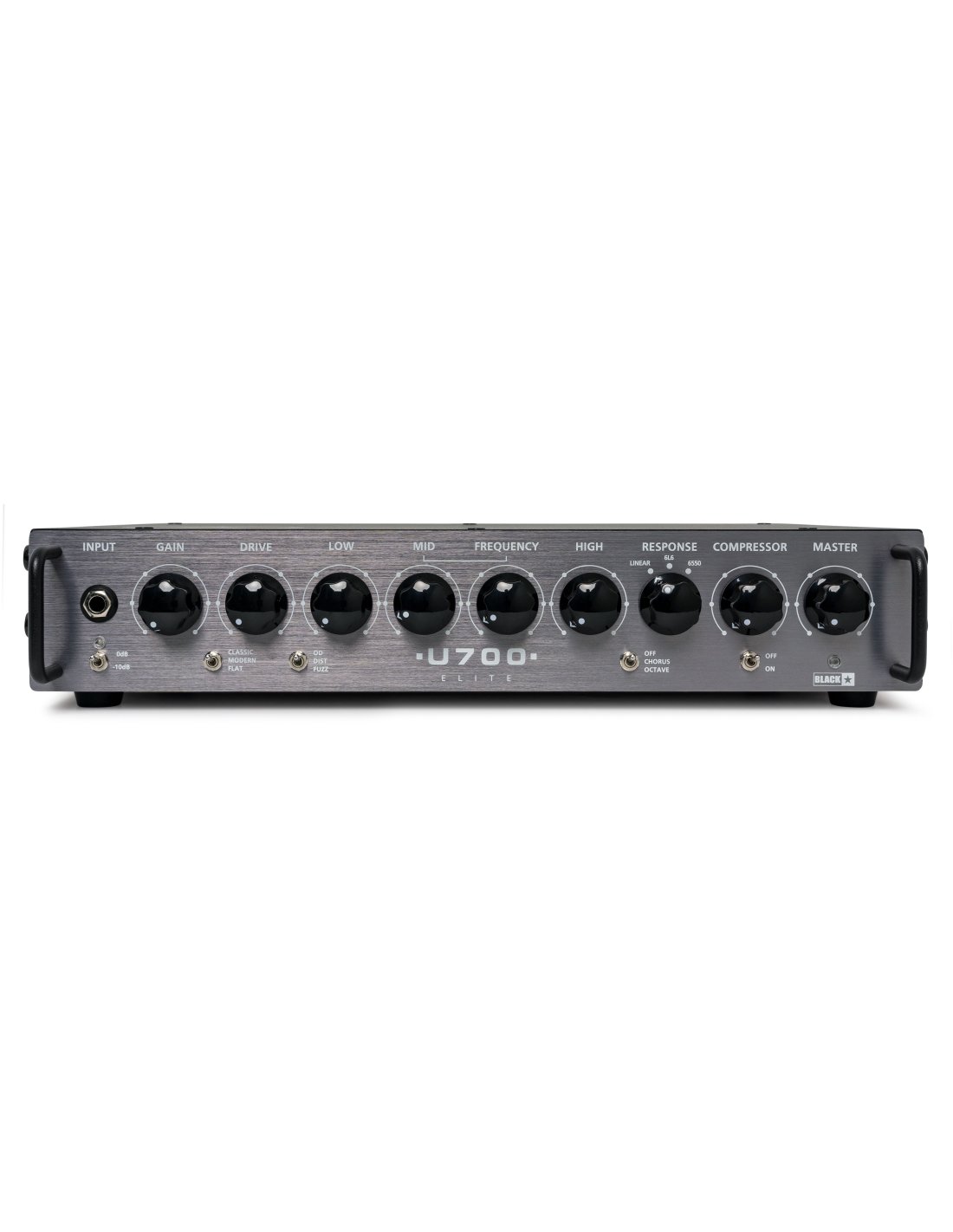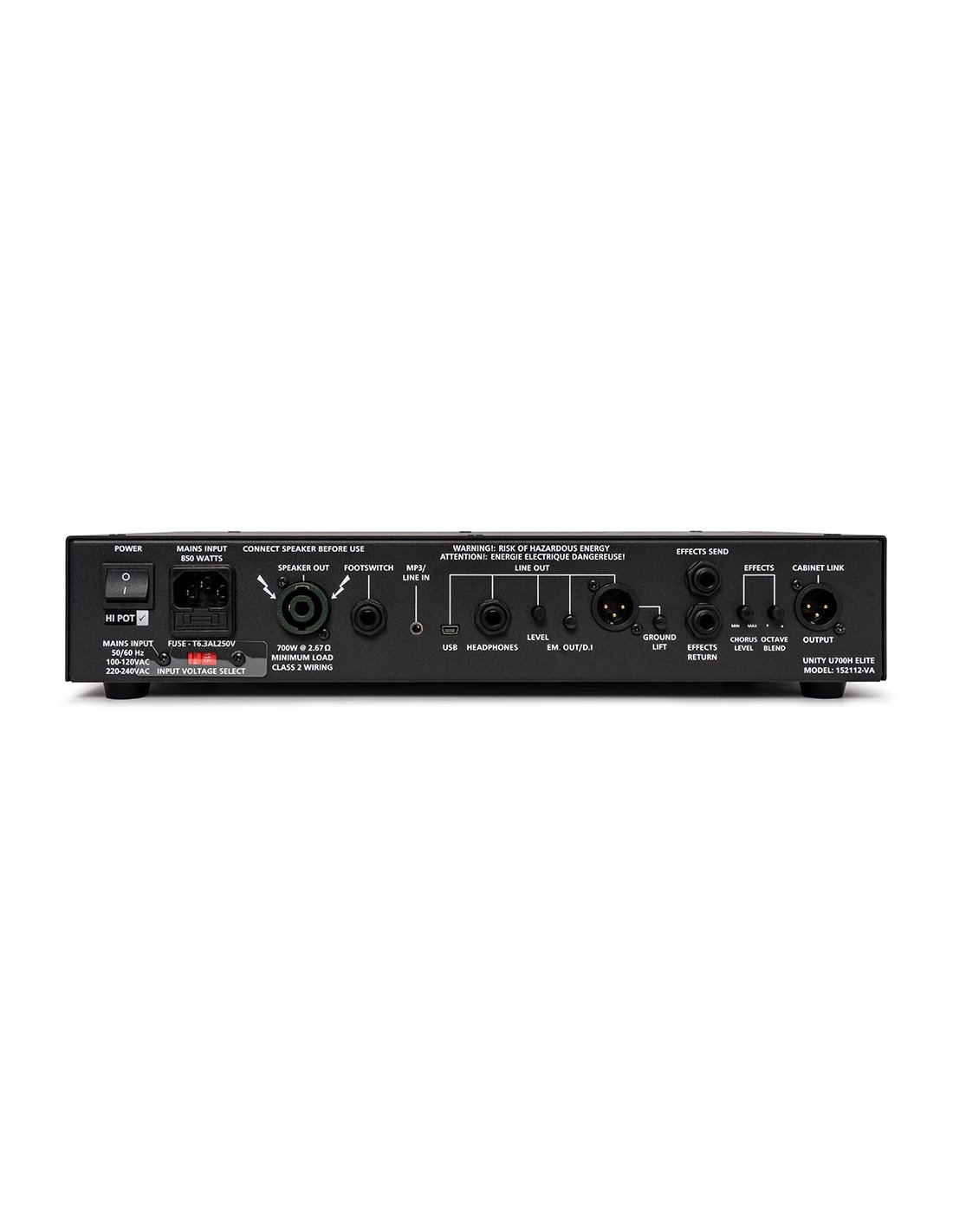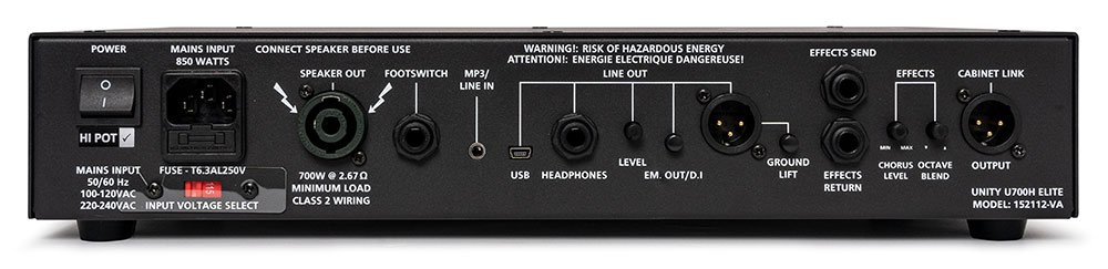 'Testata Unity ELITE U-700. L'headroom Elite Head eroga 700 W di potenza, abbastanza chiarezza tonale per qualsiasi situazione live. Power 700W, (2.67 Ohms minimum load) Voices: Classic, Modern, Flat. Drive: OD, Dist, Fuzz, EQ Semi-parametric, Effects: Chorus, Octave, Compressor. Level Control, MP3 / Line In, Line Out USB, Headphones, XLR (Em. Out or D.I.), 378mm X 77mm X 251.6mm, 4.2kg'