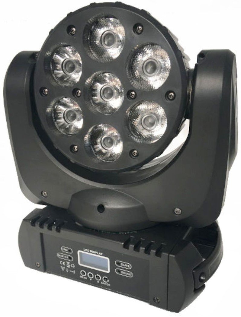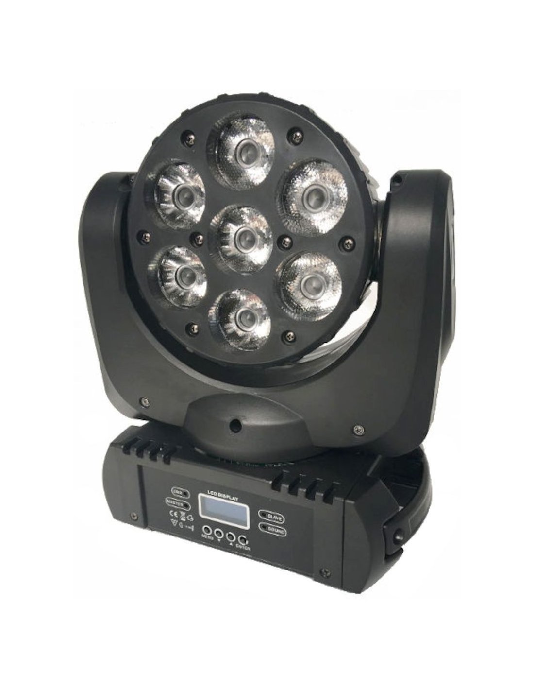 ATOMIC4DJ LOTUS 712. Testa mobile motorizzata a Led con 7 led Cree da 12W multicolor ognuno: rosso, verde , blu e bianco. Le caratteristiche tecniche includono sistema color mixture QCL 4 led in 1 RGBW, modalità di funzionamento DMX512, Master Slave, Auto e Sound, 2 modalità DMX selezionabili 9/16 CH, pannello di controllo con display LCD, DMX In/Out tramite XLR 3pin. Staffa per montaggio a sospensione inclusa.