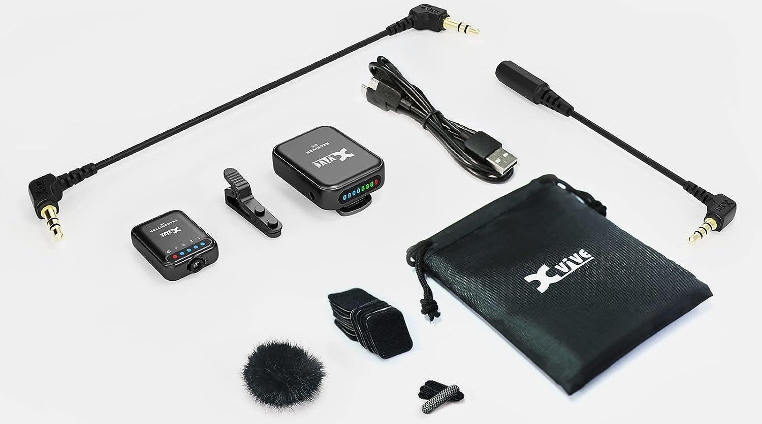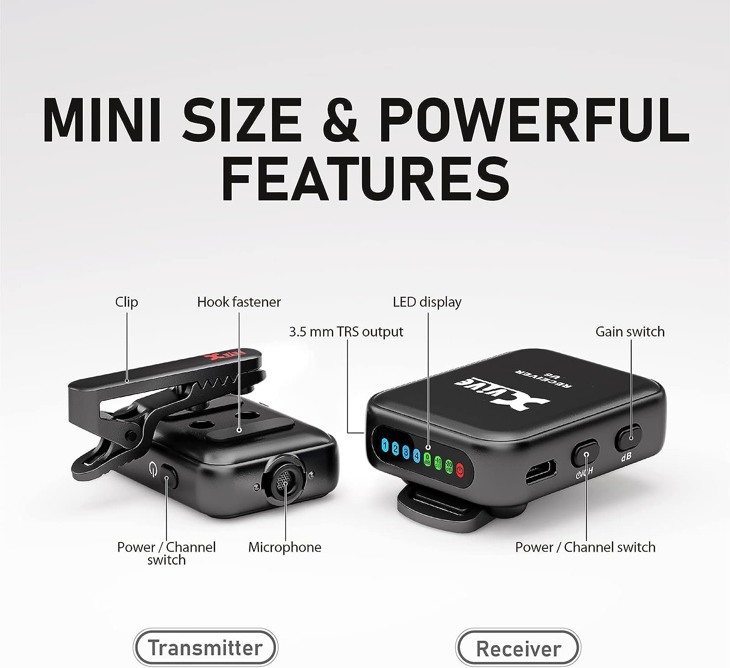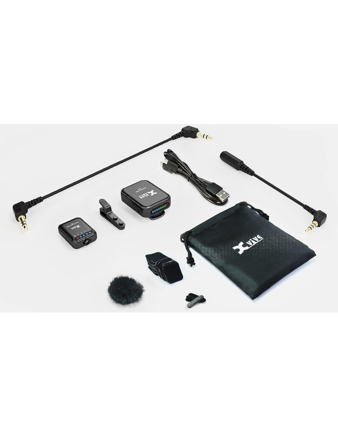XVIVE U6 COMPACT WIRELESS MIC SYSTEM è un sistema Wireless trasmettitore/ricevitore per DSLR, videocamere e smartphone. Le caratteristiche tecniche includono trasmissione in banda 2,4Ghz con antenna True Diversity, conversione 24-bit/48 kHz con 100Db di dinamica, risposta in frequenza 20Hz-20Khz, 4 canali selezionabili, latenza inferiore a 5 ms, range di 27,4m (in assenza di ostacoli), fino a 5 ore di funzionamento con una singola carica - Batteria al Litio integrata - Autonomia: 4h - Tempo di ricarica: 2h - Chassis in ABS - doppio cavo USB per ricarica incluso