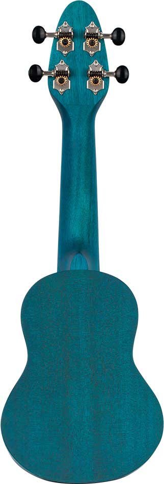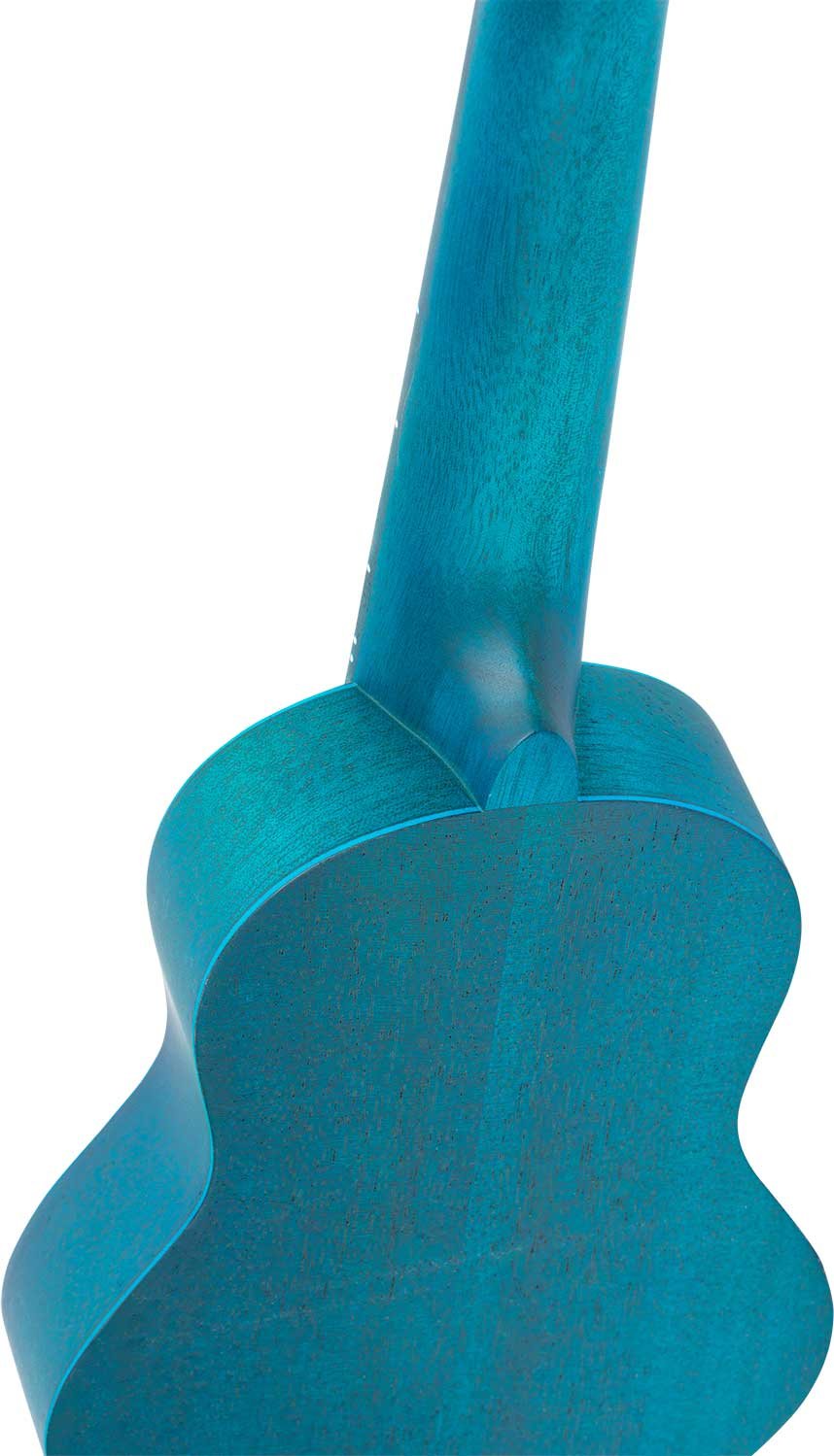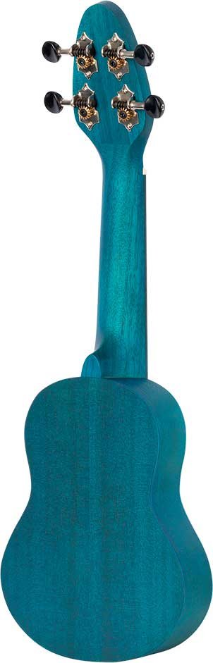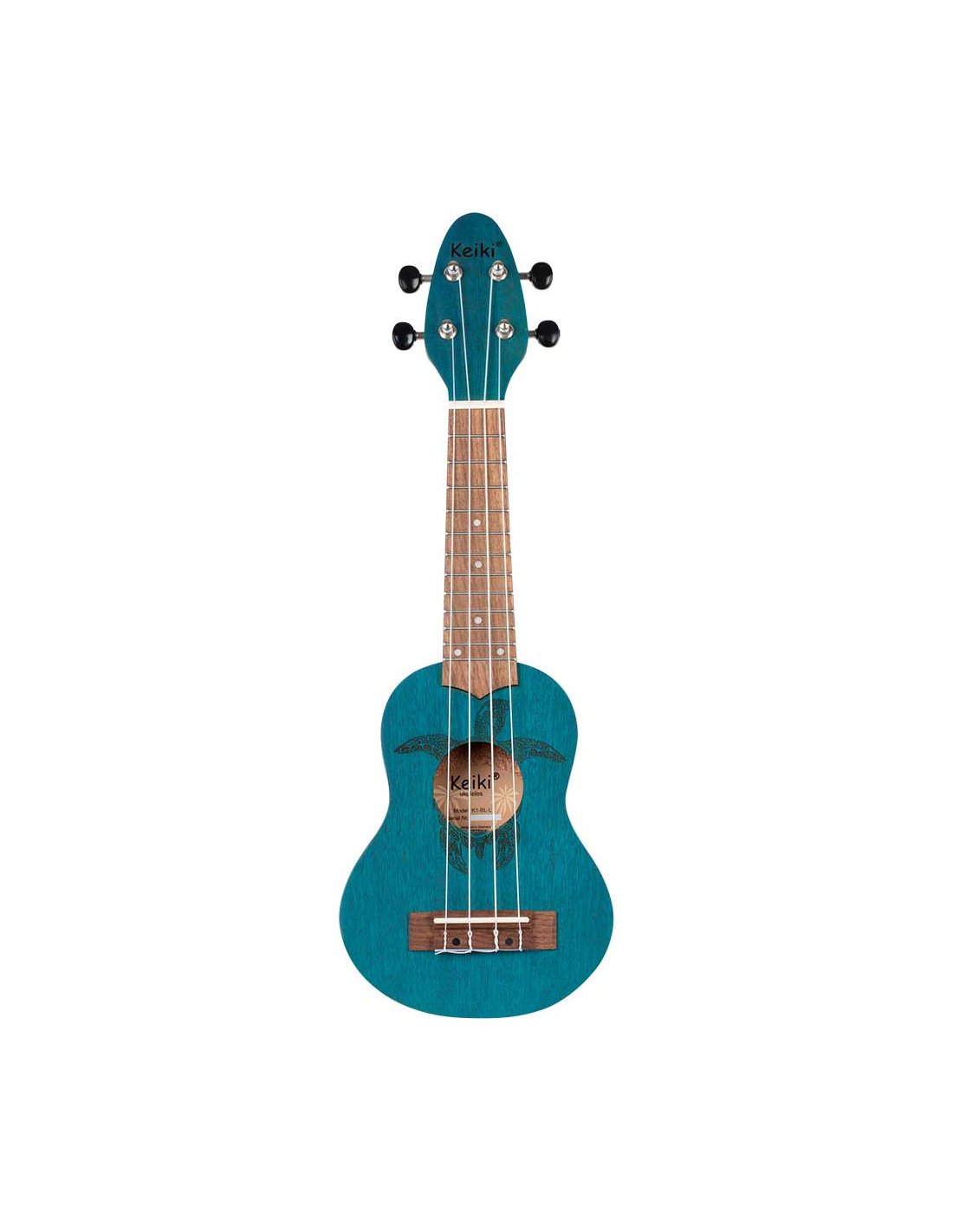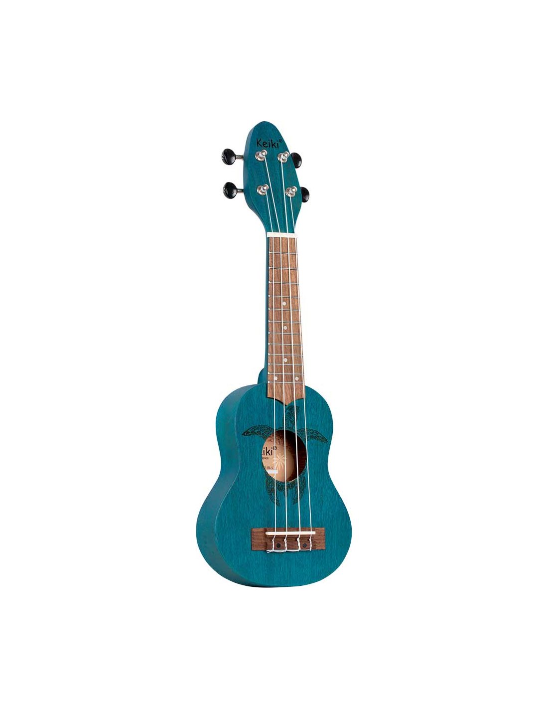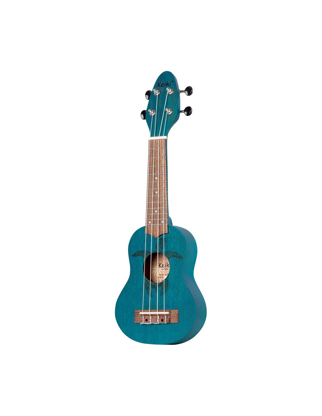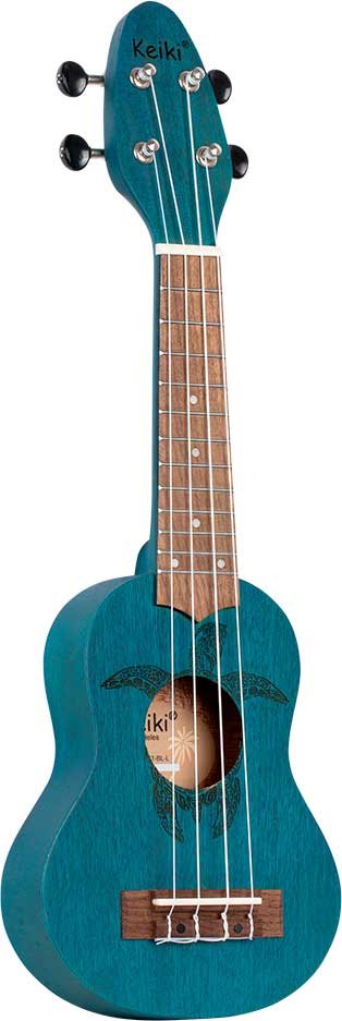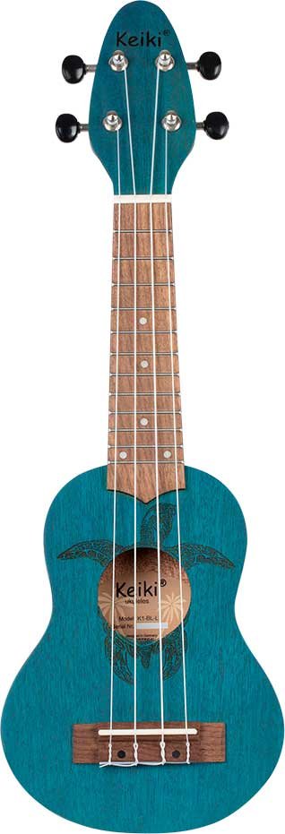 Ukulele Sopranino Keiki K1-MM per MANCINI. (più piccolo del soprano, scala 248mm). Finitura in azzurro satinato. Corpo e manico in okume, tastiera e ponte in nogal. Top in okume con incisione a laser di una tartaruga. Meccaniche nere cromate. Monta corde Ortega UWNY--4-SO per soprano standard.