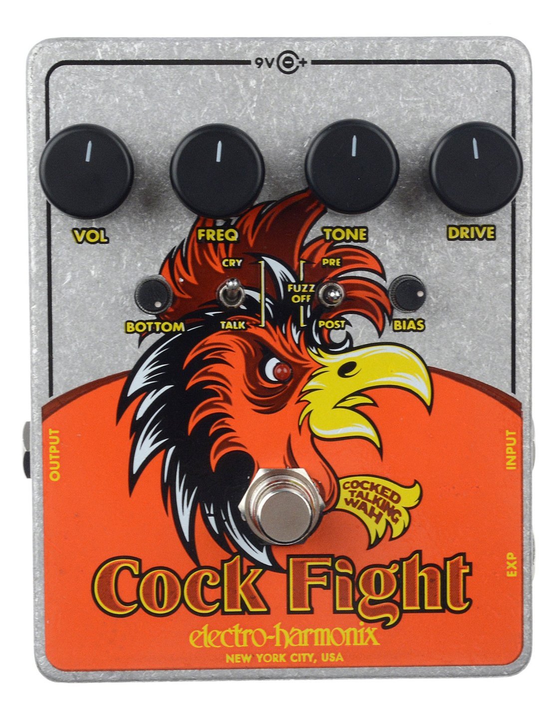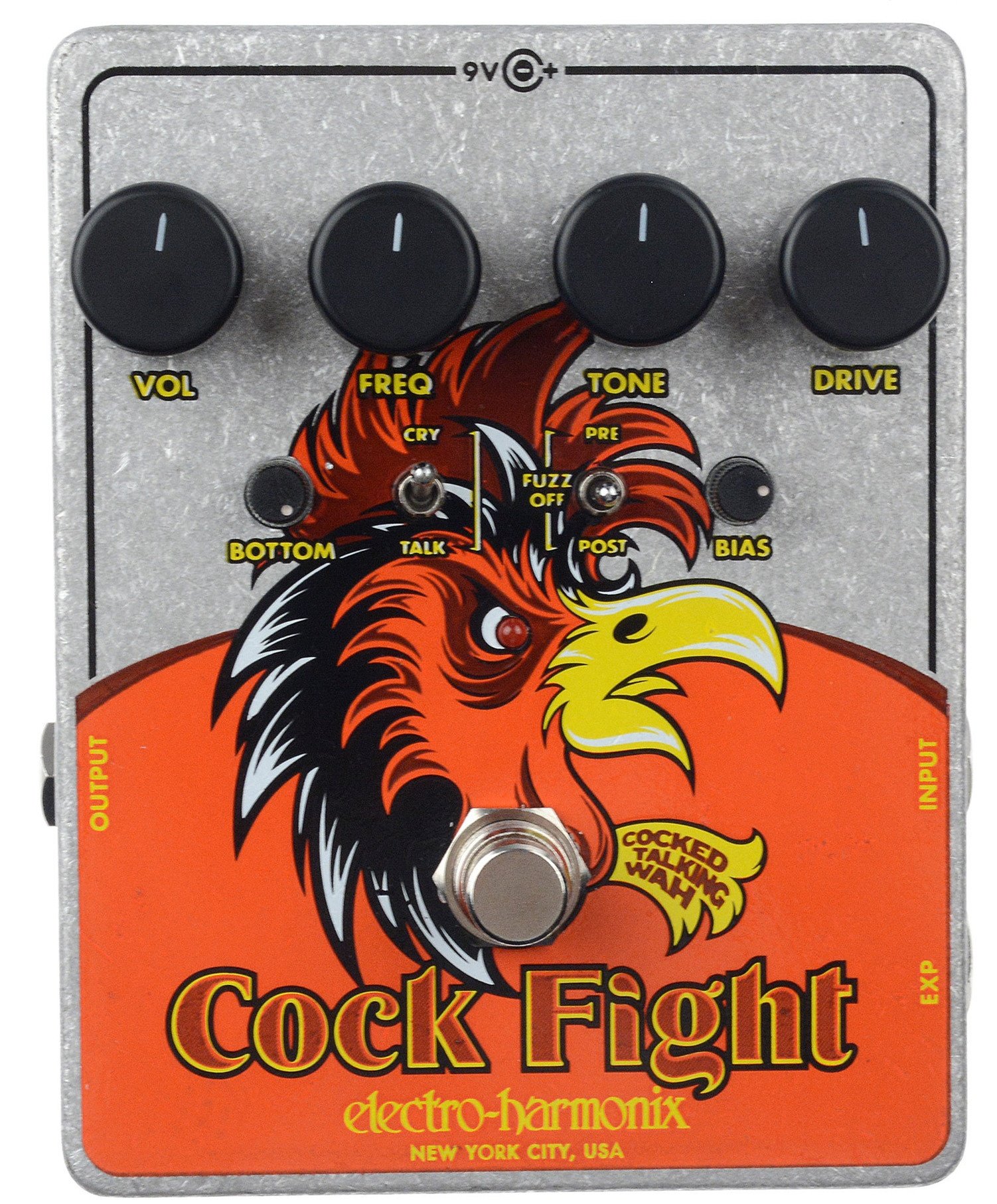 Pedale per Chitarra Electro Harmonix Cock Fight Cocked Talkin Wah. L'Electro Harmonix Cock Fight Cocked Talkin Wah è un pedale per chitarra che racchiude un wah, un filtro talkbox e un fuzz. E’ dotato dei controlli Vol, Freq, Tone, Drive, Bottom, Bias e dei mini interruttori Cry/Talk, Fuzz Off Pre/Post. E' configurabile come wah automatico o manuale collegando un pedale d'espressione.