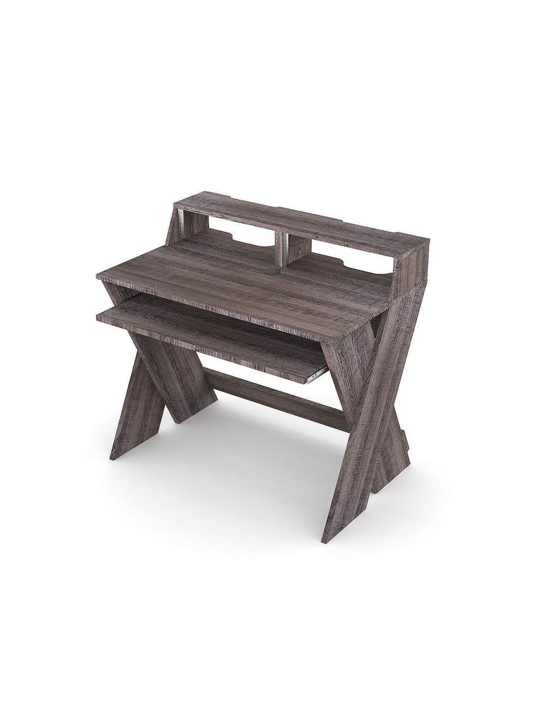 Console di lavoro professionale con un design compatto e ben organizzato, ideale per le workstation di produzione musicale, dotata di piano estraibile per master keyboard (max 61 tasti), 2 alloggiamenti da 3U rack 19", foro passacavi, piano di appoggio dimensionato per accogliere tastiera, mouse, mixer, controller o altro, piano rialzato per monitor video e monitor audio, realizzazione in legno MDF da 20 mm, dimensioni 1016 x 932 x 650 mm, peso circa 30 kg, assemblaggio semplice e senza problemi, colore noce.